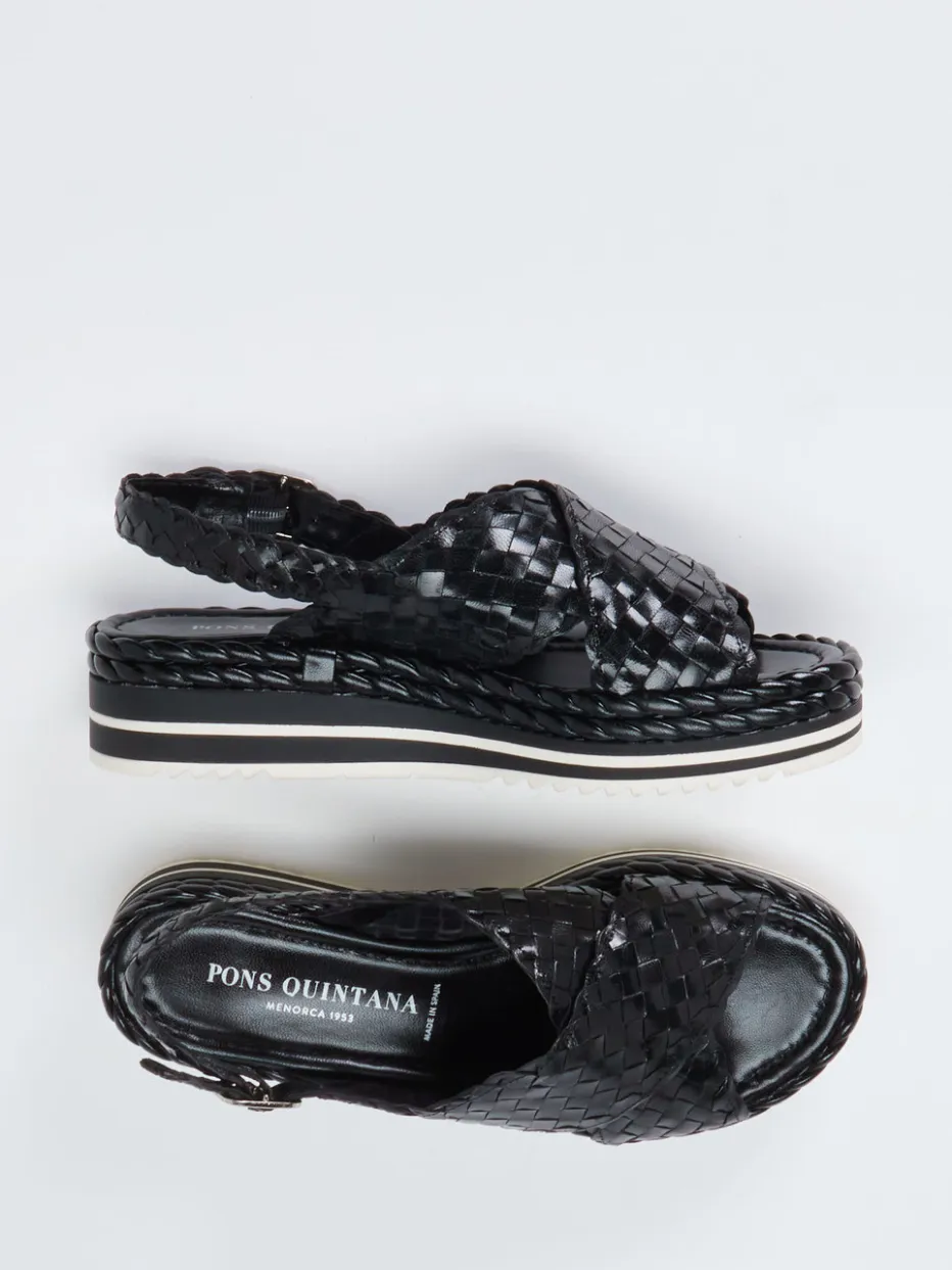 Handwerkskunst trifft Komfort.Pons Quintana präsentiert Plateau-Sandalen für Damen aus hochwertigem geflochtenem Leder. Ideal für den Urlaub oder entspannte Sommertage in der Stadt: Das schwarze Flechtleder mit glänzender Oberfläche verleiht der überkreuzten Vorderpartie mediterranen Charme. Ein verstellbarer Fersenriemen mit silberfarbener Schnalle sorgt für individuellen Halt, während die zweifarbige Gummisohle mit dezentem Keilabsatz rutschfesten Tragekomfort bietet. Die plateauförmige Silhouette unterstützt den Look handgefertigter Eleganz – angesagt im Stiltrend „Geflochtene Texturen SS24“. Kombiniert mit Korbtasche und Leinenkleid entsteht ein harmonisches Sommeroutfit. Markenqualität von Pons Quintana für anspruchsvolle Casual-Looks in warmen Monaten.