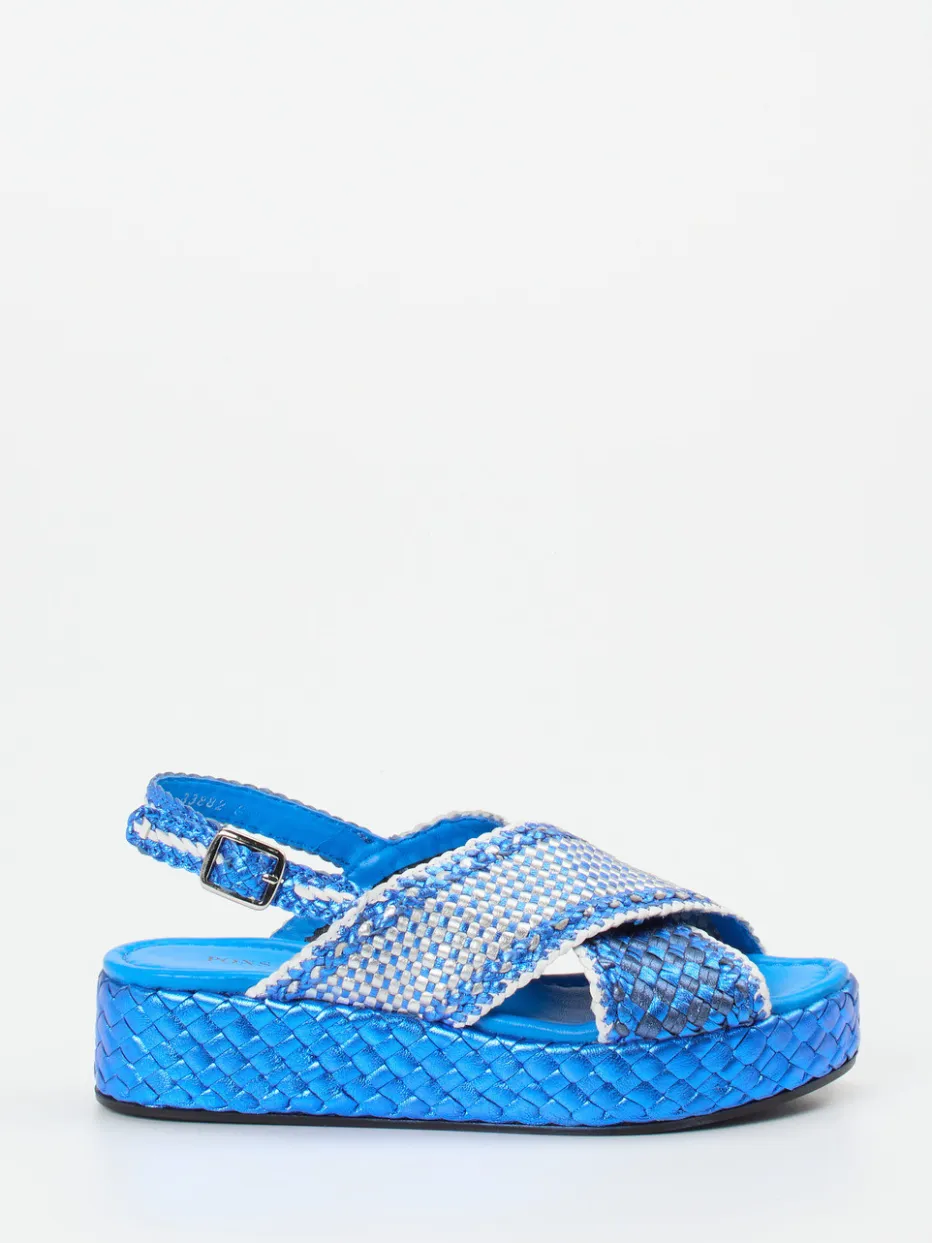 Sommerstil mit mediterranem Charakter.Pons Quintana präsentiert mit dieser Plateau-Sandale ein stilsicheres Modell für Damen. Ideal für warme Tage in der Stadt oder am Strand, vereint diese Sandale Komfort mit Designanspruch. Das ausdrucksstarke Kobaltblau betont das metallisch schimmernde Flechtleder, das gekonnt über gekreuzte Riemen zur Geltung kommt. Ein verstellbarer Fersenriemen mit Silber-Dornschließe ergänzt den sicheren Halt, während die durchgehende Gummisohle mit integriertem Keil einen sanften Höhengewinn bietet. Der offene Schnitt verleiht dem Modell Leichtigkeit. Der charakteristische Pons Quintana-Stil zeigt handwerkliches Flair in trendbewusster Umsetzung.