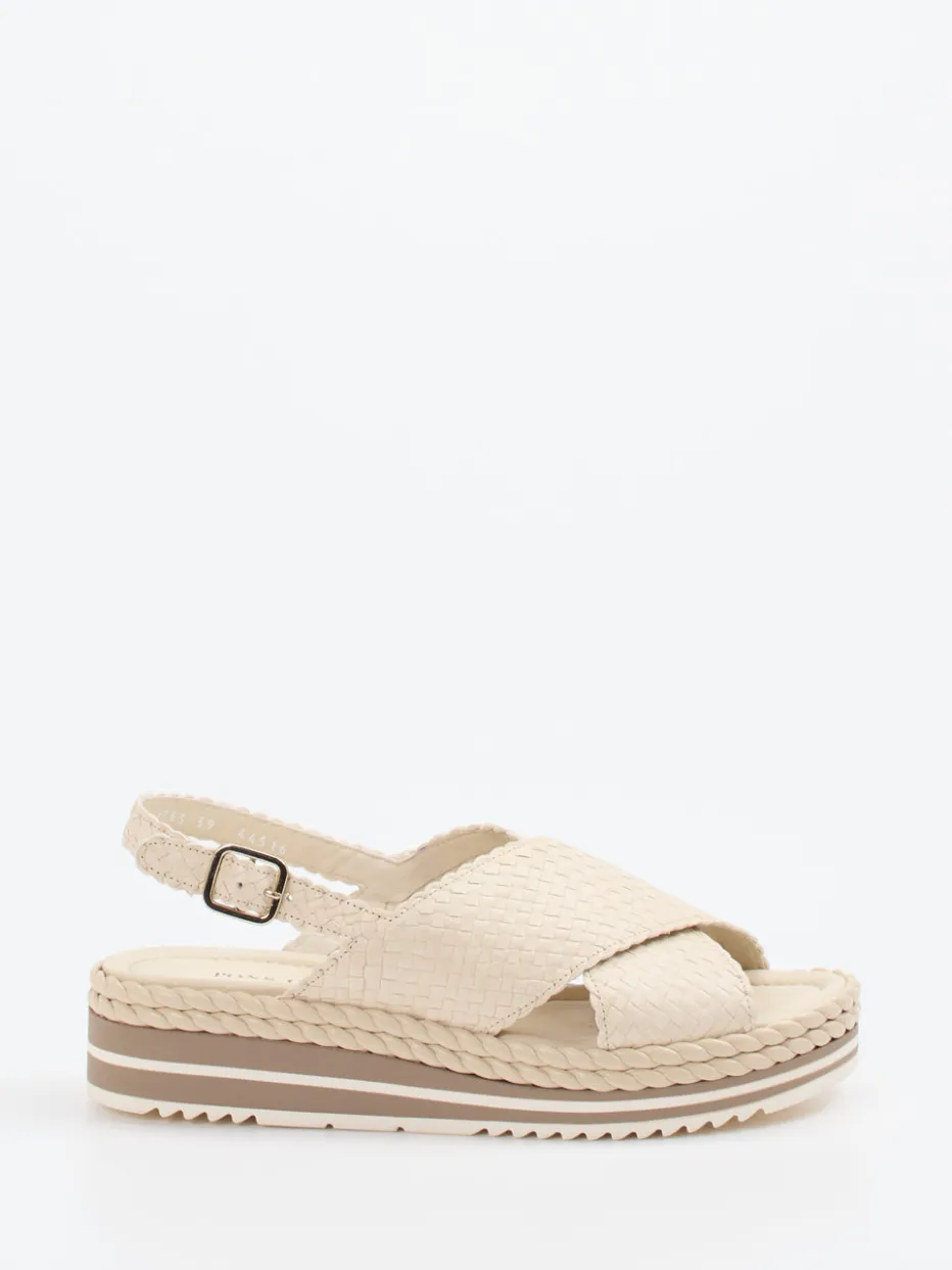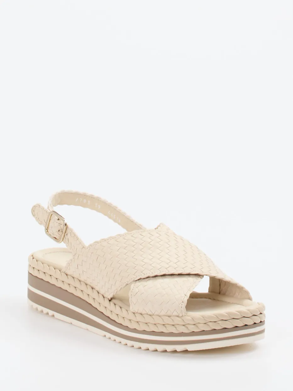 Feines Ziegenleder in geflochtener Ausführung und eine leicht erhöhte Plateausohle verleihen dieser Sandalette sommerlichen Komfort mit mediterraner Leichtigkeit.
