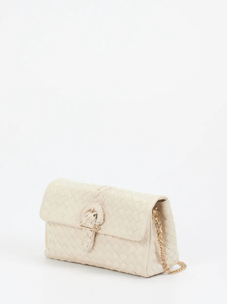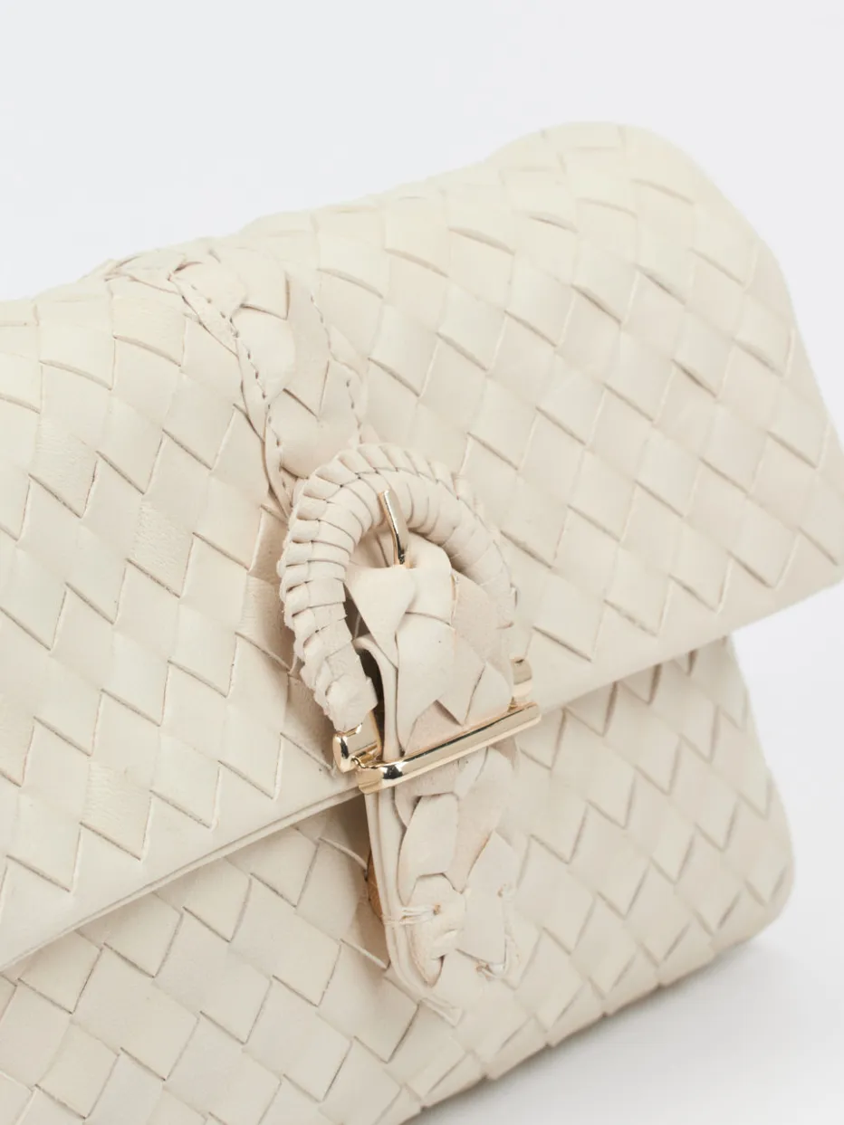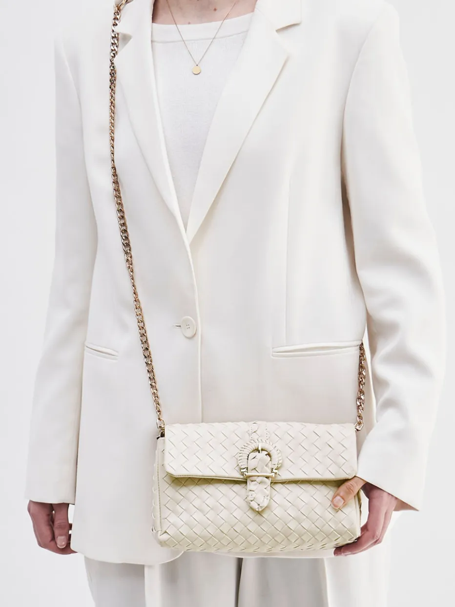 Die rechteckige Crossbody Bag von Pons Quintana vereint klare Linien mit luxuriösem Charme – Flechtoptik trifft auf goldene Akzente in elegantem Cremeweiß.