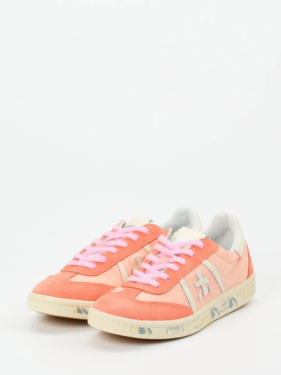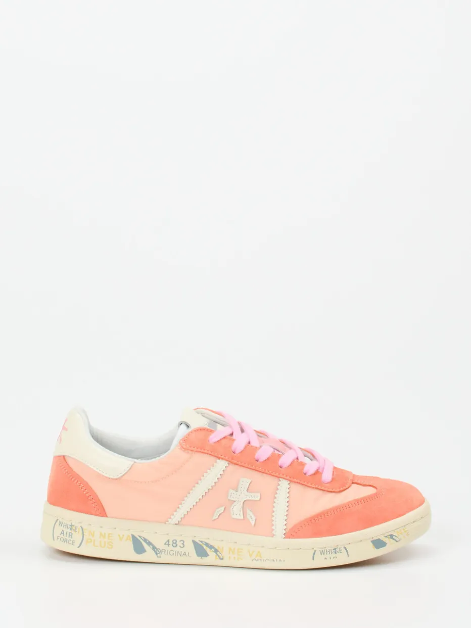 Retro-Pastell trifft Sommerlaune.Premiata präsentiert einen Damen-Low-Top-Sneaker, der stilbewusste Freizeitlooks auf ein neues Level hebt. Ob beim Stadtbummel oder auf Reisen – das Modell überzeugt mit einem Materialmix aus Veloursleder, lachsfarbenem Nylon und cremeweißem Glattleder. Die samtige Oberfläche steht im spannenden Kontrast zur glänzenden Struktur. Farblich dominieren Lachsrosa und Pink, ergänzt von cremeweißen Details und einer auffälligen, bunt bedruckten Gummisohle. Die klassische, flache Silhouette und das seitliche Markenlogo vervollständigen den Streetwear-inspirierten Y2K-Style. Ideal zu Pastell-Hoodies oder einer Canvas-Tote kombiniert. Ein Premiata-Sneaker mit klarer Designhandschrift und modischer Relevanz.