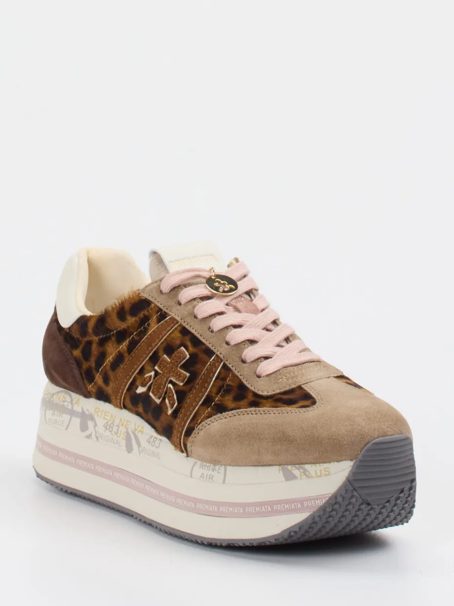 Animalprint trifft auf urbanen Stil.Premiata präsentiert einen Plattform-Sneaker für Damen, der mit modischer Raffinesse besticht. Ideal für ausdrucksstarke Streetstyle-Looks bei City-Ausflügen oder geselligen Abenden, setzt dieser Sneaker auf eine stilvolle Kombination aus Velour/Textil mit samtiger Fellstruktur. Der hellbraune Grundton, akzentuiert mit dunkelbraunem Leomuster und roséfarbenen Schnürsenkeln, verleiht dem klassischen Plateauprofil eine feminine Note. Goldfarbene Ösen und ein Sohlen-Branding runden das Design ab. Die griffige Gummisohle sorgt für Komfort im Alltag, während das Modell als Key-Piece aktueller Animalprint- und Plateau-Trends fungiert. Lässig kombinierbar zu Oversized-Pieces oder monochromen Styles. Ein markanter Eyecatcher von Premiata mit stilvollem Trendfaktor.
