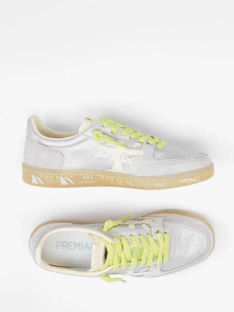 Streetwear mit Stilpotenzial.Premiata präsentiert mit diesem Sneaker ein Statement-Stück der zeitgenössischen Mode. Für urbane Styles mit trendiger Note bietet dieser Low-Top-Sneaker ein stilvolles Zusammenspiel aus silberfarbenem Metallicleder und samtig angeschliffenem Veloursleder. Die hellgraue Grundfarbe wird durch leuchtend neongelbe Schnürsenkel kontrastiert, während das klassische flache Design von einer markant bedruckten, transparenten Gummisohle getragen wird. Ein seitliches Logo-Overlay sowie eine perforierte Zehenkappe akzentuieren die sportive Silhouette. Das Modell überzeugt durch ein bequemes, wechselbares Lederfußbett und eignet sich ideal für Freizeit- und Partykombinationen mit Cargo-Hose oder Satinrock. Premiata steht für innovative Ästhetik mit luxuriösem Komfortanspruch.