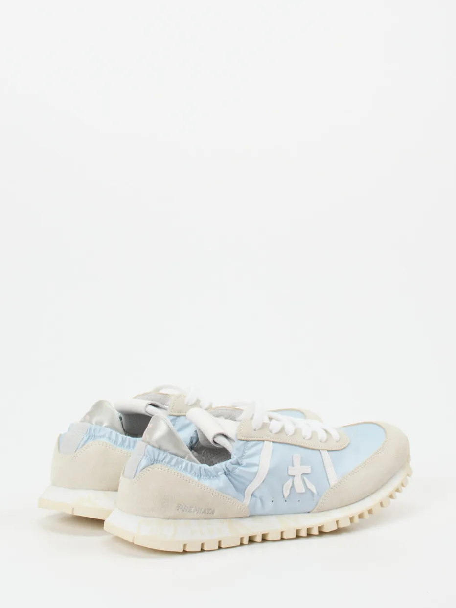 Leichtigkeit trifft Retro-Charme.Premiata kombiniert bei diesem Damen-Sneaker sportliche Raffinesse mit nostalgischem Design. Für urbane Tage mit stilvollem Anspruch sorgt die Verbindung von samtig angeschliffenem Veloursleder, glattem Textil und robustem Nylon. Das pastellblaue Obermaterial mit weißen und offwhitefarbenen Details verleiht dem Modell seinen soften, sommerlichen Look. Die klassische, flache Silhouette mit Retro-Profilsohle und Logodetails auf Zunge und Ferse greift Vintage-Elemente der 90er-Jahre auf. Schnürung, Gummisohle und gepolsterter Fersenbereich steigern den Tragekomfort. Perfekt für entspannte Looks mit weiter Hose oder Jogpants. Ein starker Auftritt für trendbewusste Casual-Outfits mit ikonischem Premiata-Stil.