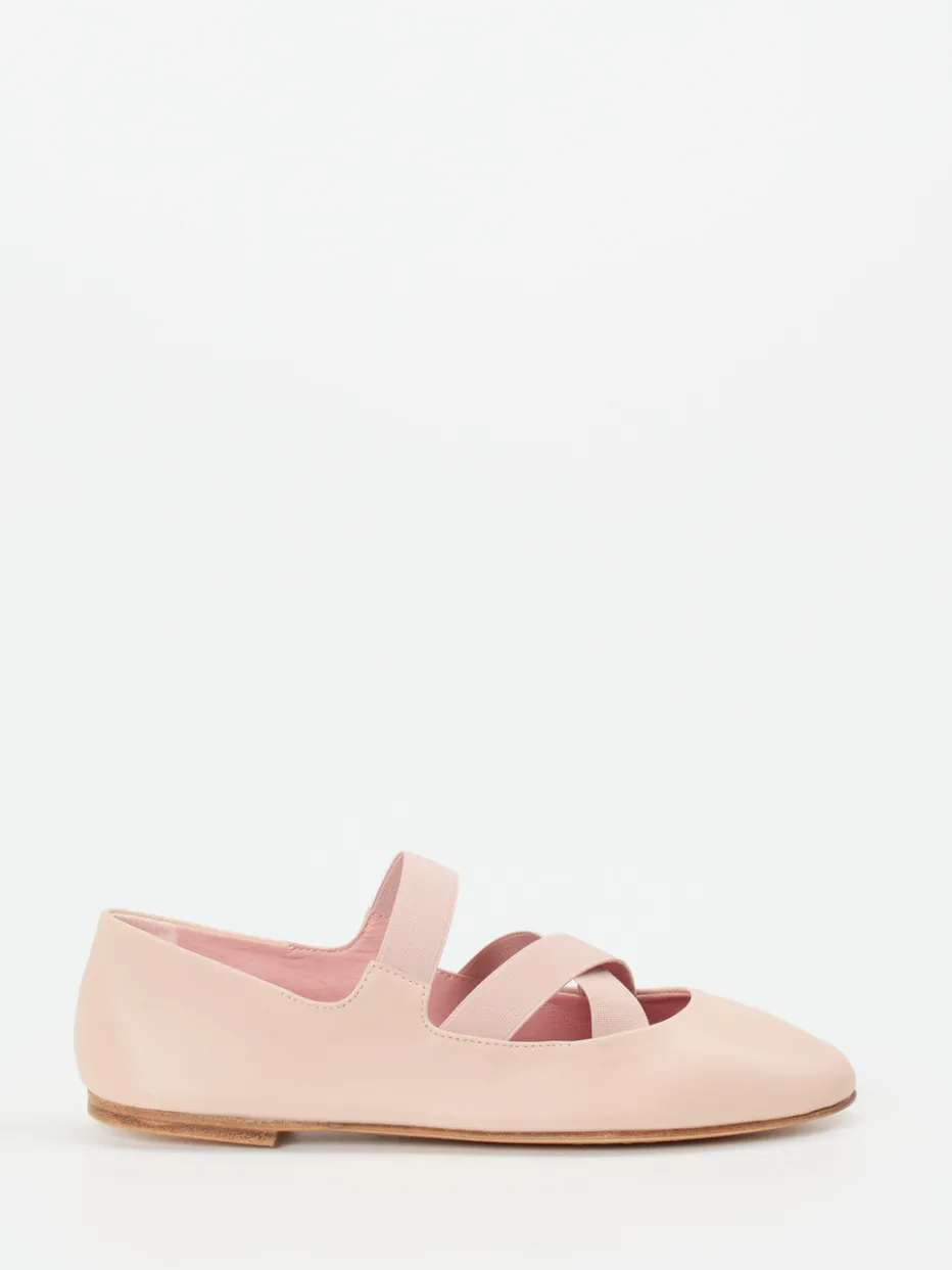 Gefertigt aus feinem Lammleder mit matter Oberfläche passt sich der Schuh angenehm weich an. Die elastischen Kreuzriemen in Ton-in-Ton-Optik bieten Halt, ohne den klassischen Look zu stören. Der zarte Rosaton greift den Trend zu Soft Neutrals auf, die flache Silhouette wirkt puristisch. Die flexible Ledersohle unterstreicht die Leichtigkeit des Modells. Ein echter Favorit für minimalistische Styles – etwa zu Leinen oder feinem Strick.