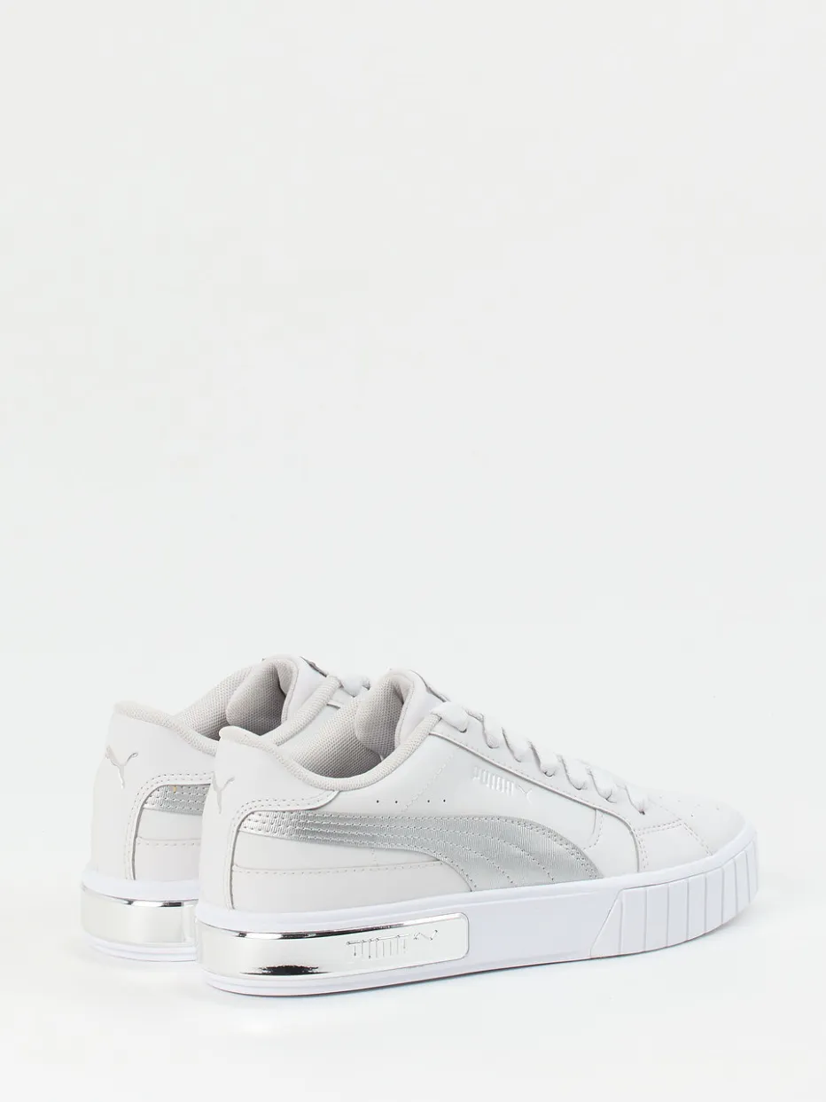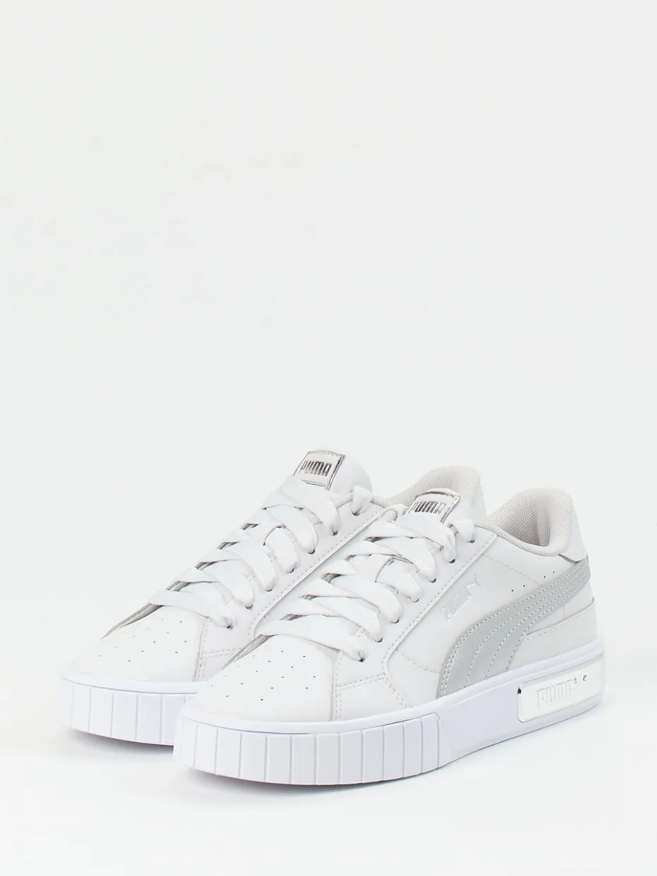 Clean Look trifft Metallic-Eleganz.Puma präsentiert mit diesem Damen-Sneaker ein stylisches Modell aus der Linie Cali Star Metal Wn’s. Für entspannte Alltagsmomente oder urbane Streetstyle-Kombinationen bietet der Sneaker eine gelungene Verbindung aus Funktionalität und modischem Statement. Das weiße Leder erhält durch die matte Oberfläche und hellgraue Akzente einen modernen Charakter, während ein silberfarbenes Element an der Ferse und ein glänzendes Logo seitlich für visuelle Highlights sorgen. Der Schnürverschluss und das bequeme Textilfutter mit herausnehmbarer Innensohle sorgen für angenehmen Komfort. Die Plateausohle aus Gummi unterstreicht den sportlichen Stil. Ein stilvoller Allrounder mit trendorientierter Detailveredelung von Puma.