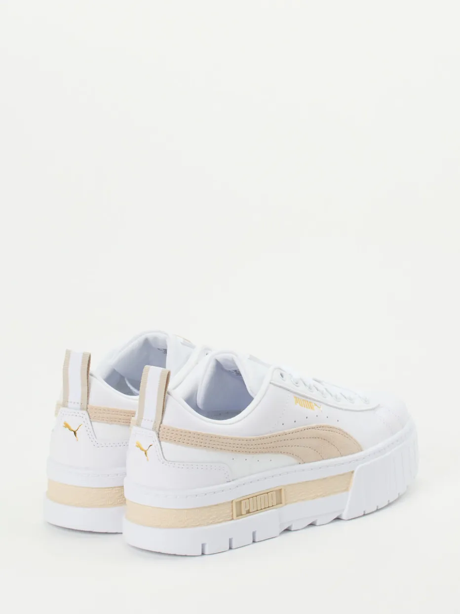 Der Puma Plateau-Sneaker kombiniert glattes und veloursartiges Leder in neutralen Tönen mit goldfarbenem Logo für einen modernen Y2K-Streetstyle-Look.