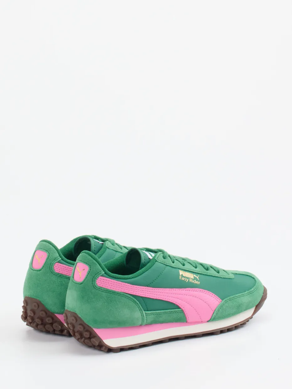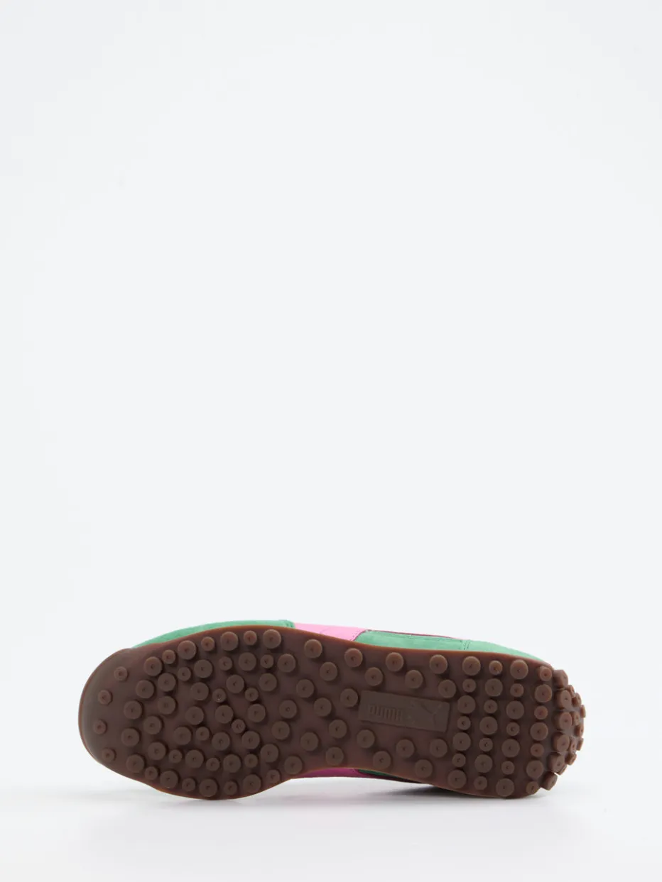 Streetstyle mit Vintage-Charakter.Puma präsentiert einen Unisex-Sneaker der Kategorie Retro-Runners, inspiriert vom Look klassischer 70er-Jahre-Laufschuhe. Grasgrünes Textil und samtig angeschliffenes Veloursleder bilden einen hochwertigen Materialmix, während pinke Seitenstreifen und ein goldfarbener Logoprint augenfällige Akzente setzen. Die flach-zulaufende Form mit profilierter Gummisohle bietet Halt im Alltag und unterstreicht den sportlich-authentischen Stil. Ideal kombinierbar mit Trainingsjacke oder Jeans – ein klares Statement für trendorientierte Streetwear-Looks. Ein Sneaker mit Komfort, Charakter und ikonischer Puma-DNA.