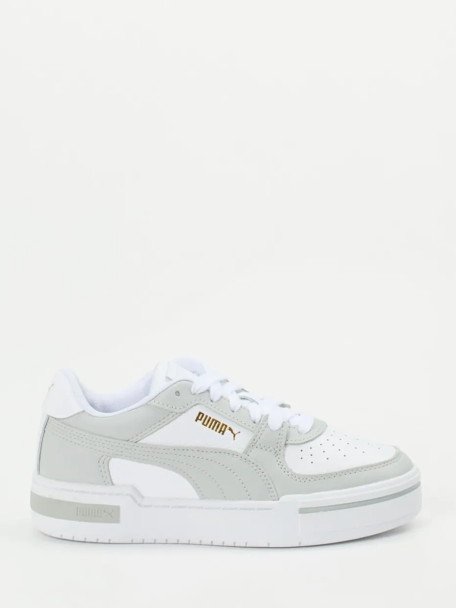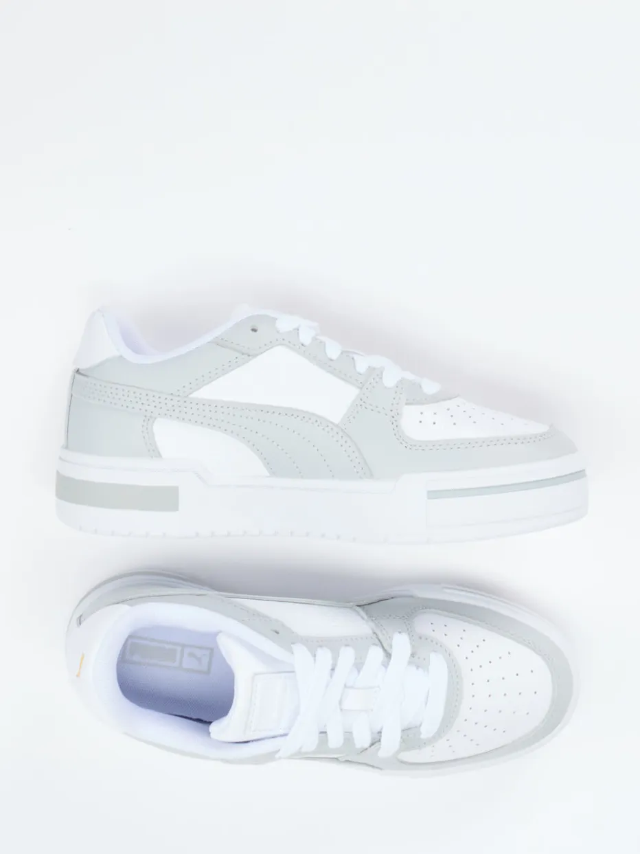 Cleanes Design mit Retro-Note.Die Marke Puma präsentiert mit diesem Sneaker eine sportlich-legere Interpretation des klassischen Court-Stils. Ob bei entspannten City-Touren oder dem Weg zum Fitnessstudio – die klare Silhouette in Weiß und Hellgrau trifft den Streetwear-Zeitgeist. Hochwertiges Leder wurde glatt verarbeitet und durch goldfarbene Logos sowie Ton-in-Ton-Nähte stilvoll ergänzt. Der gepolsterte Schaftrand und die herausnehmbare Innensohle sorgen für angenehmen Tragekomfort im Alltag. Dank seiner cleanen, reduzierten Optik passt der Sneaker flexibel zu lässigen Outfits mit Jogginghose oder Denim. Puma vereint Funktionalität mit ikonischer Retro-Ästhetik – ein Stilstatement mit Komfortanspruch.
