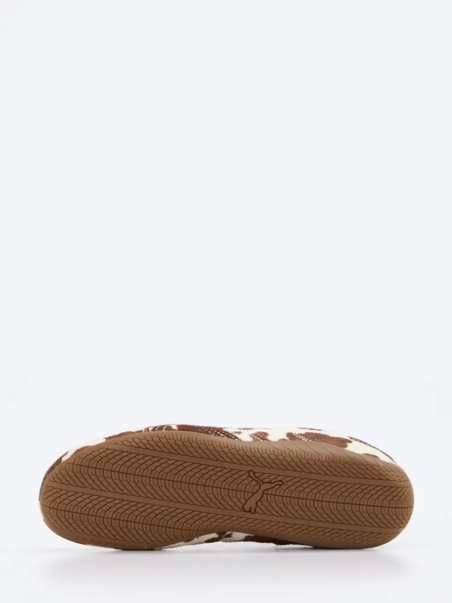 Seine auffällige Kuhfell-Optik mit braun-weißer Farbgebung greift den Trend der Animal Prints auf und wird durch eine haarige Oberfläche sowie eine flache, schlank zulaufende Silhouette ergänzt. Das Obermaterial besteht aus Leder, das in Kombination mit der strukturierten Gummisohle und der Schnürung einen authentisch sportlich-retro-inspirierten Look erzeugt. Tonale Nähte und ein geprägtes Seitenlogo runden das Design stilvoll ab. Der Schuh lässt sich ideal mit Jogpants oder Oversized-Hoodies kombinieren.