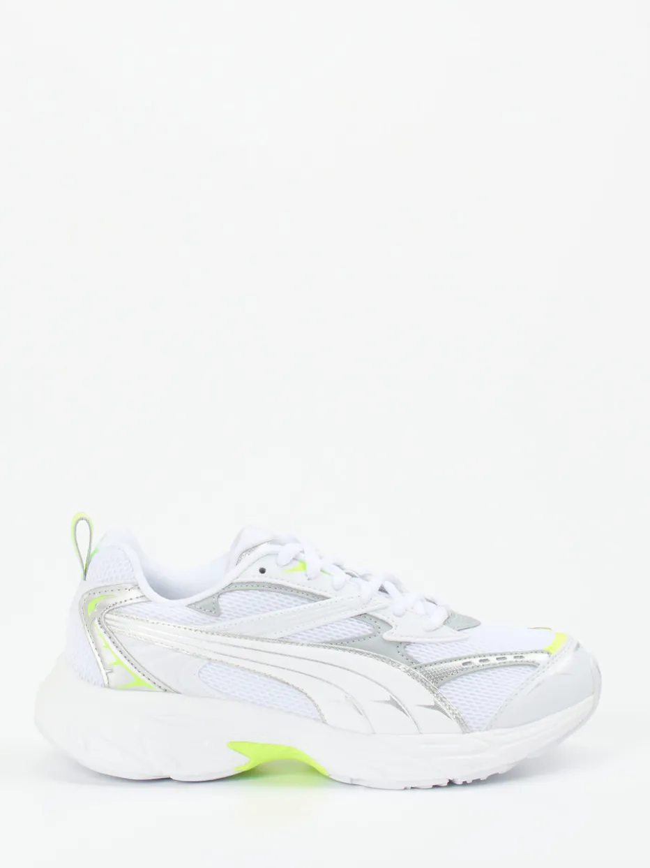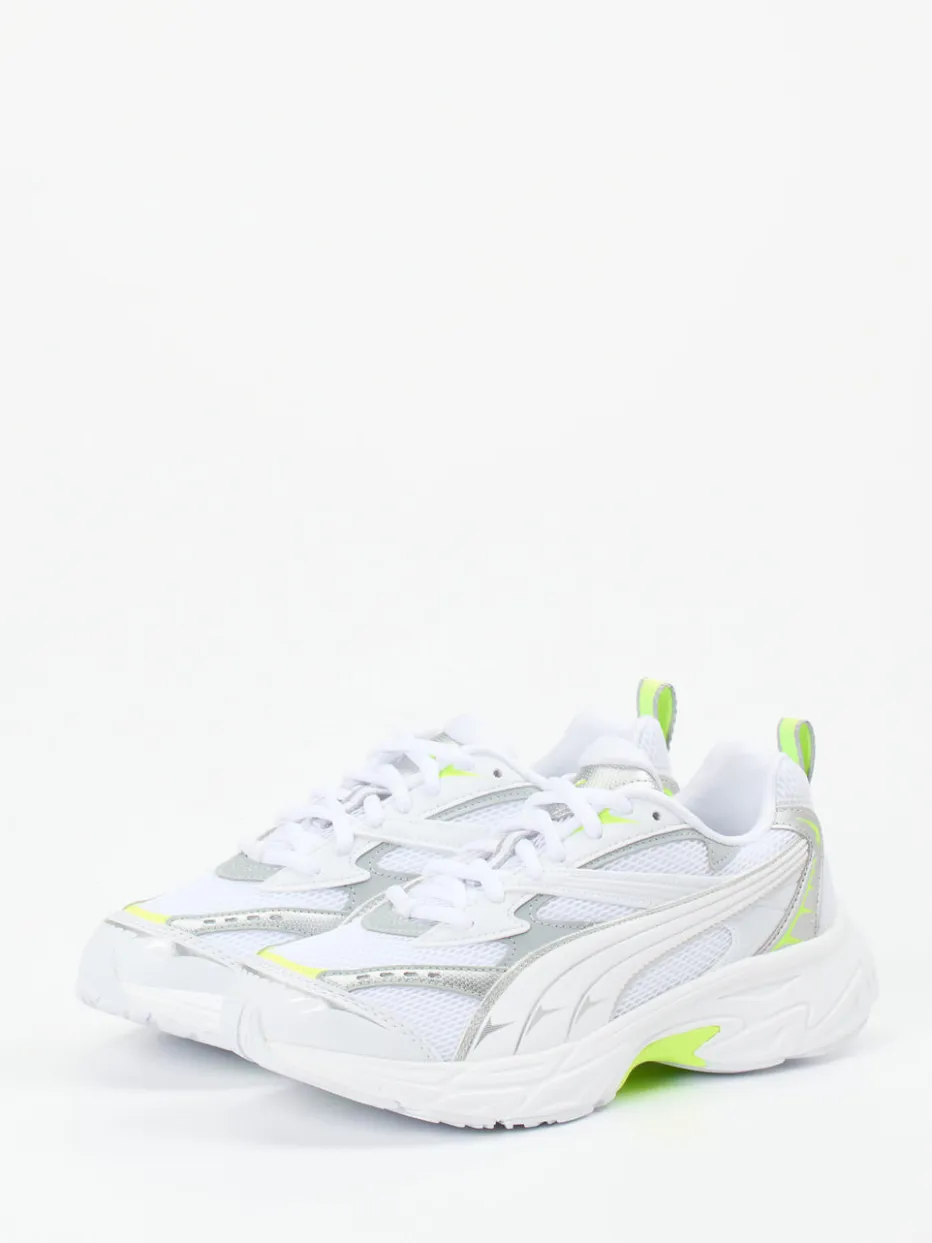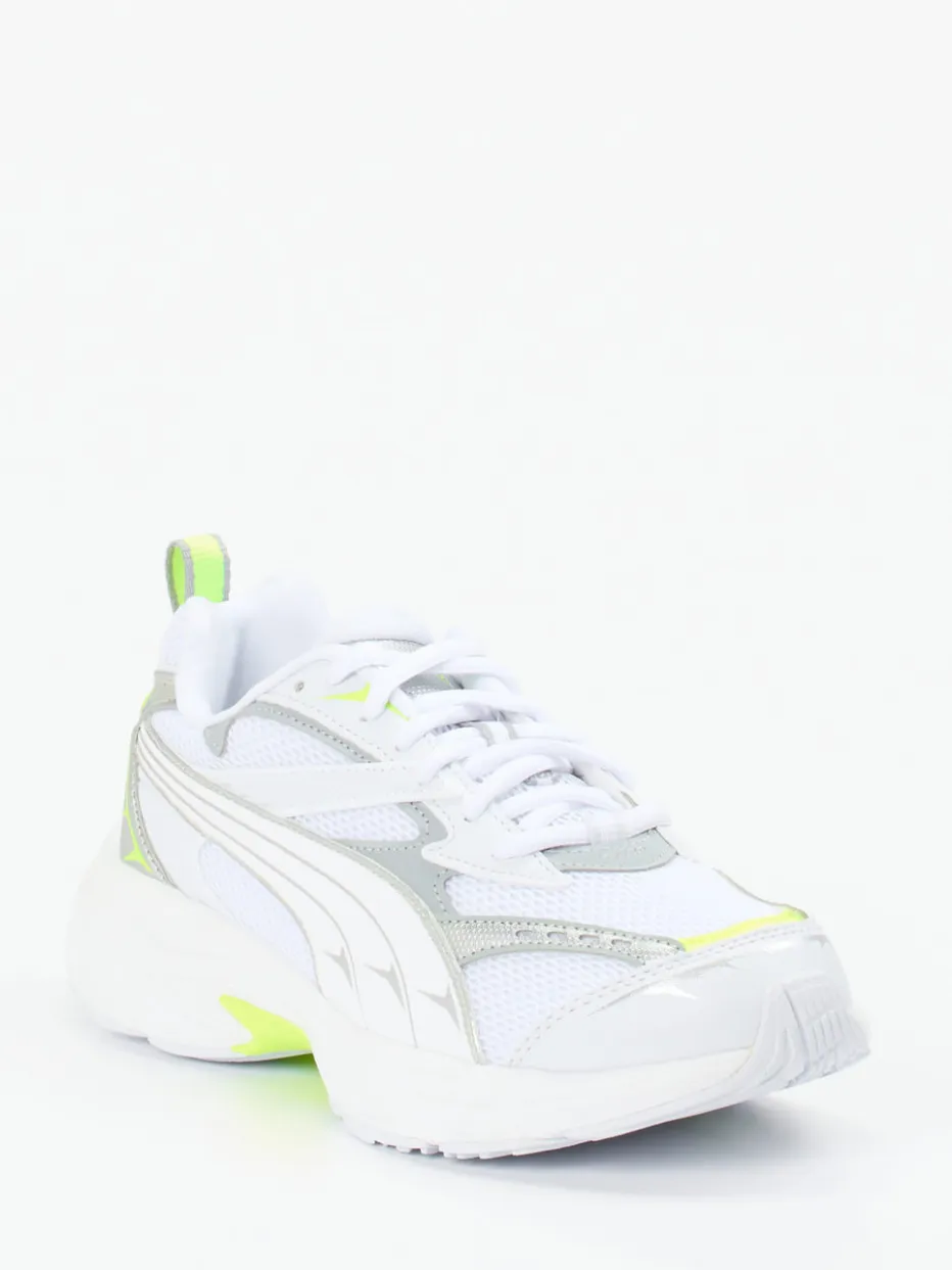 Neon trifft Retro-Laufstil.Puma präsentiert diesen dynamischen Freizeitsneaker in moderner Running-inspirierter Formgebung. Das Obermaterial aus Textil zeigt sich in einer Kombination aus glänzenden Mesh-Strukturen und synthetisch wirkenden Overlays. Kontraststarke Details in Neon-Limette und reflektierende Elemente setzen markante Designzeichen. Auffällig voluminös in der Silhouette und geprägt vom Retro Runner Trend, wird der Schuh zum Statement in jedem Streetwear- und Athleisure-Look. Schnürung und Zuglasche hinten sorgen für funktionelle Alltagstauglichkeit. Ein Sneaker, der mit ikonischem Design und sportlicher Attitüde das Erbe des Y2K-Styles neu interpretiert.
