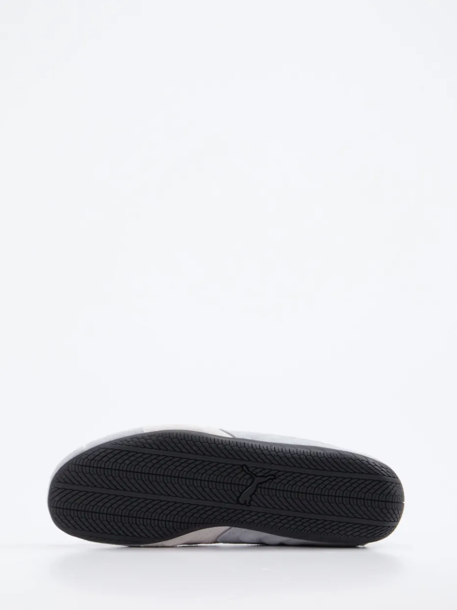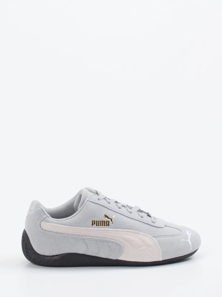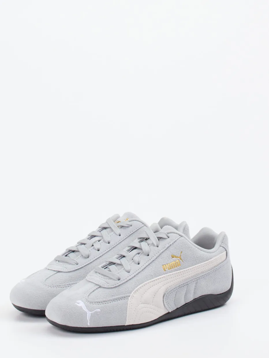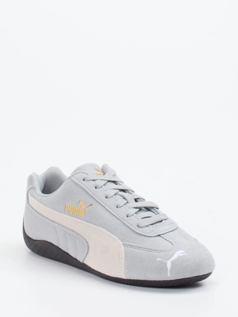 Ideal für Streetwear-Outfits oder aktive Tage in der Freizeit: Das Modell kombiniert hellgraues Veloursleder mit samtig-matter Oberfläche, geschnürtem Verschluss und kontrastierendem Formstreifen. Goldfarbene Logoprints sorgen für optische Highlights, während die flach-schmale Silhouette und die griffig profilierte Gummisohle sportiven Komfort bieten. Der Look greift Einflüsse des Y2K-Retrotrends auf und passt hervorragend zu Joggerpants oder Oversized-Pieces.