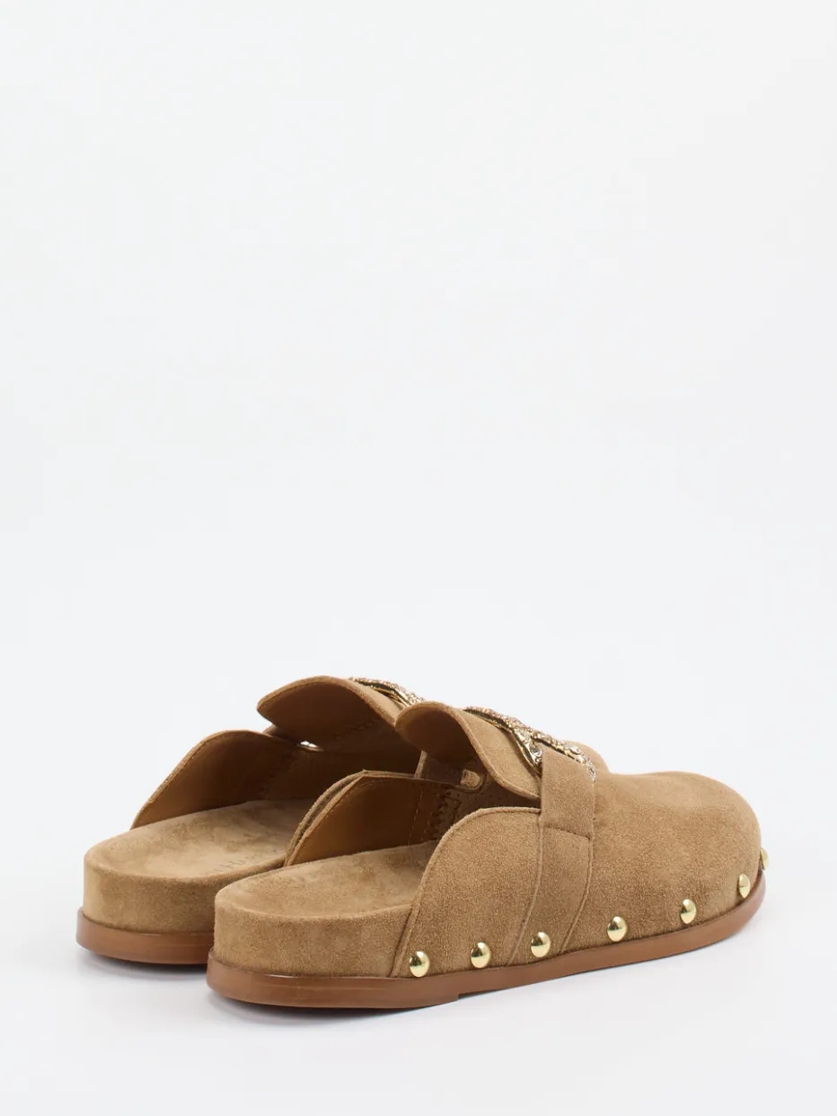 Goldfarbene Nieten und eine strassbesetzte Dornschnalle unterstreichen die luxuriöse Detailsprache, ohne den lässigen Charakter zu verlieren. Die Gummisohle sorgt für guten Halt, während der offene Fersenbereich einen unkomplizierten Einstieg bietet. Ideal für stilvolle Freizeit-Looks mit Boho-Anmutung.