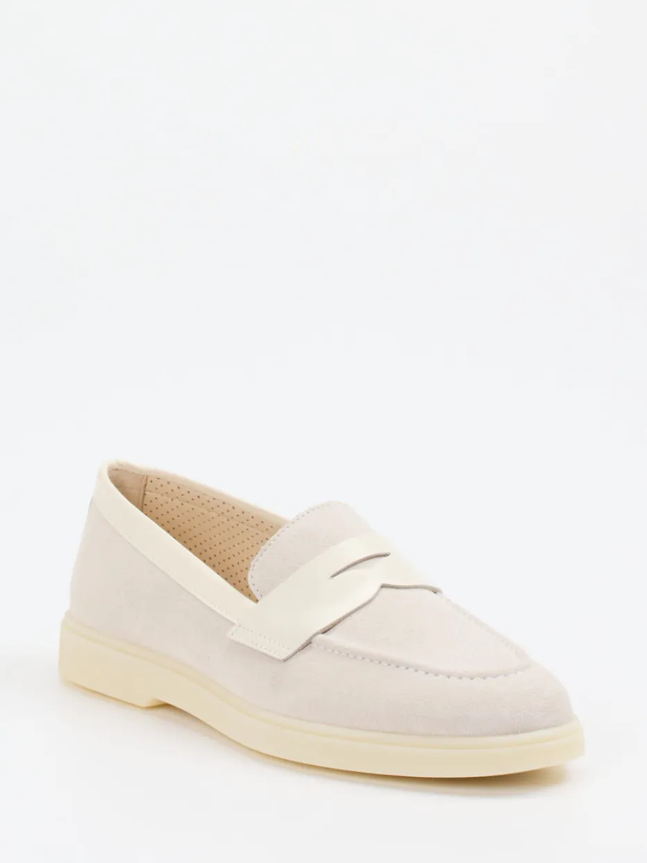 Minimalismus trifft dezente Raffinesse.Ralph Harrison präsentiert einen klassischen Damen-Loafer mit zeitloser Formsprache. Ideal für gepflegte Office-Looks oder dezente Alltagskombinationen: Der Slipper aus weichem Veloursleder – samtig angeschliffen – überzeugt mit einem glatten Lederbesatz in zartem Beige sowie einer offenkantigen Zierspange. Die flache Silhouette, das perforierte Innenfutter aus Kalbleder und die rutschhemmende Gummisohle unterstreichen den Tragekomfort. Stilistischer Kontext: Soft Neutrals und moderner Loafer-Revival. Passend zu Naturtönen oder monochromen Outfits. Ralph Harrison steht für hochwertige Materialien und detailverliebte Verarbeitung mit Komfortanspruch.