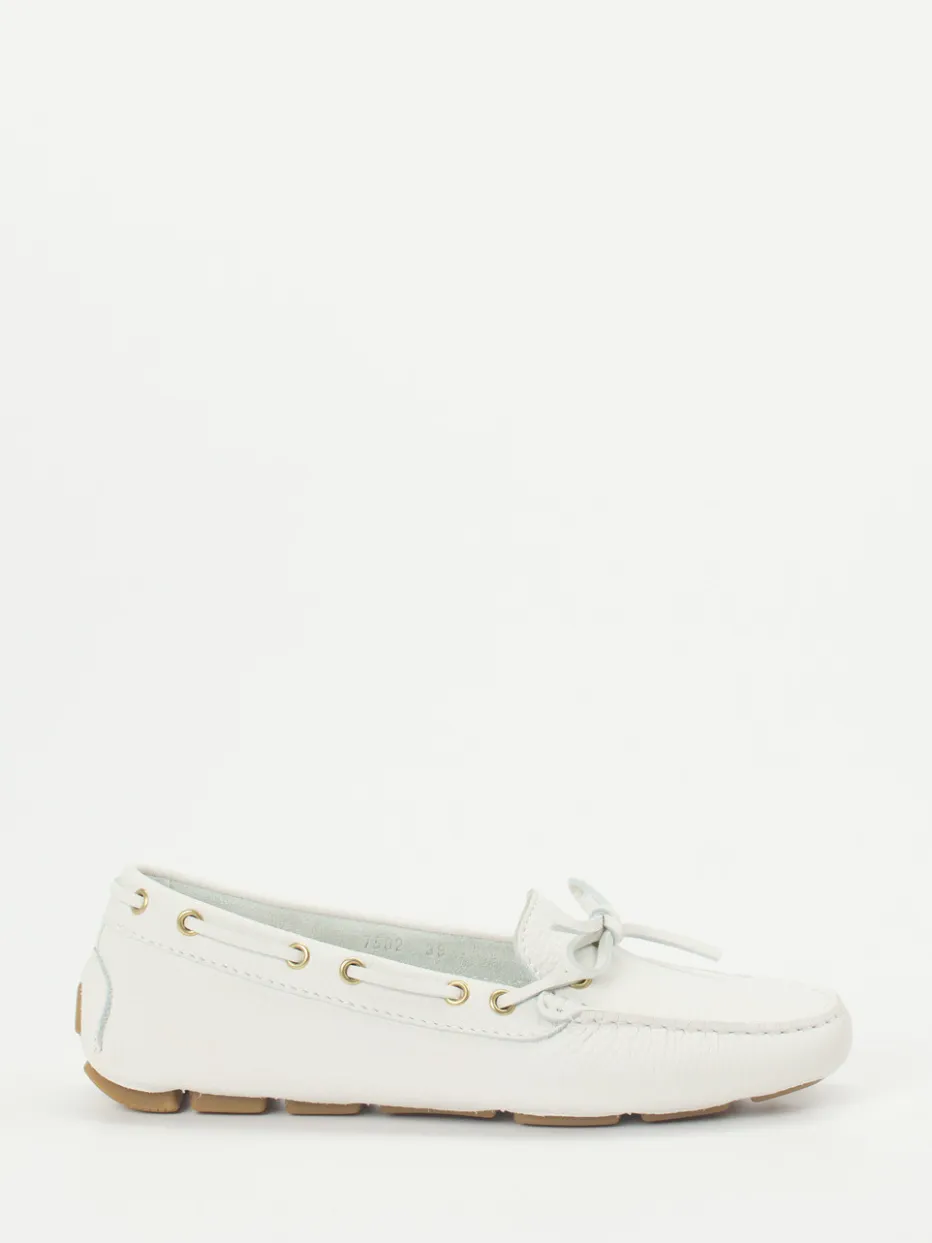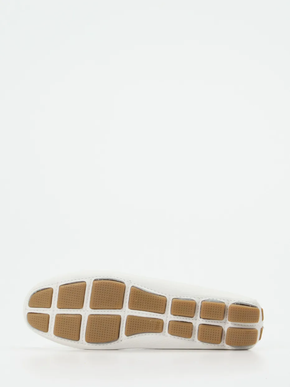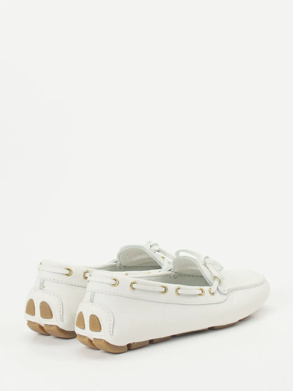Flexibel, weich und leicht sind die Attribute dieses Mokassins der Marke Ralph Harrison. Das ungefütterte, sportlich genarbte Kalbleder hat eine frische weiße Farbe. Typisch für den Stil der Bootsschuhe ist der umlaufende Senkel. Die großen, messingfarbenen Ösen schmücken und geben Glanz. Die Sohle ist an der Ferse hoch gezogen, sie besteht aus honigfarbenen Gummikassetten. Mit diesem Mokassin finden Sie ein unkompliziertes Accessoire für sommerliche Tage.