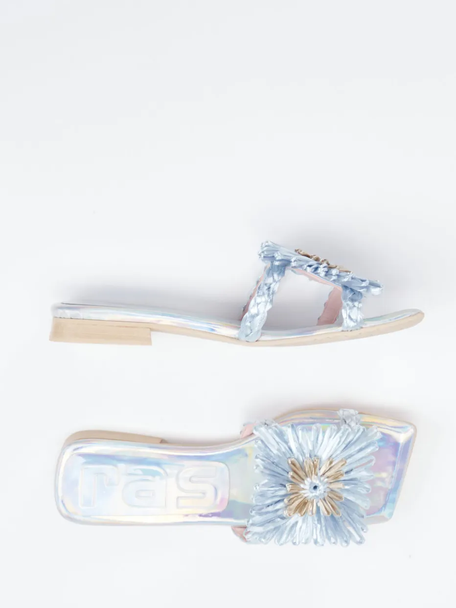 Sommerhighlight mit Glanzeffekt.Die Marke RAS interpretiert die klassische Pantolette neu und verleiht ihr charakterstarke Eleganz. Für warme Tage und glanzvolle Nächte designt, überzeugt diese Damen-Mule durch irisierendes Metallicleder in Hellblau mit schimmernden Akzenten. Geflochtene Riemen in Bast-Optik und eine großformatige Blütenapplikation machen den Look einzigartig. Der offene Schnitt mit quadratischer Spitze unterstreicht den angesagten Y2K-Vibe. Die flache Sohle aus Gummi bietet Komfort bei sommerlichen Events – ob am Strand oder auf der Roof-Top-Party. Kombinierbar mit Seidenkleid oder Metallic-Clutch. Ein modisches Statement-Stück – sinnlich, urban und trendorientiert.