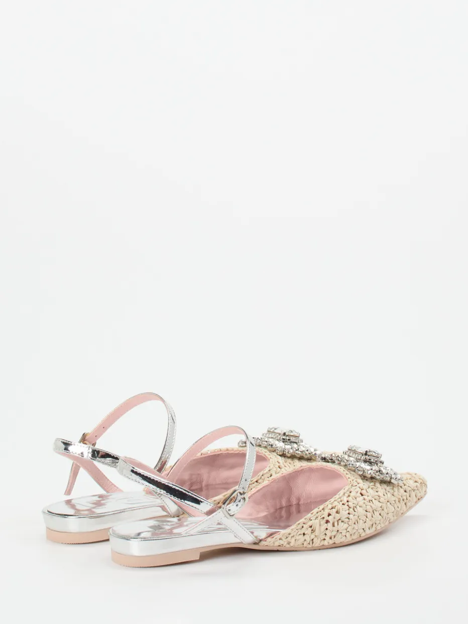 Raffiniert geflochtenes Bastmaterial trifft auf silberfarbenen Glanz und funkelnde Strassverzierung – eine elegante Wahl für stilvolle Sommermomente.