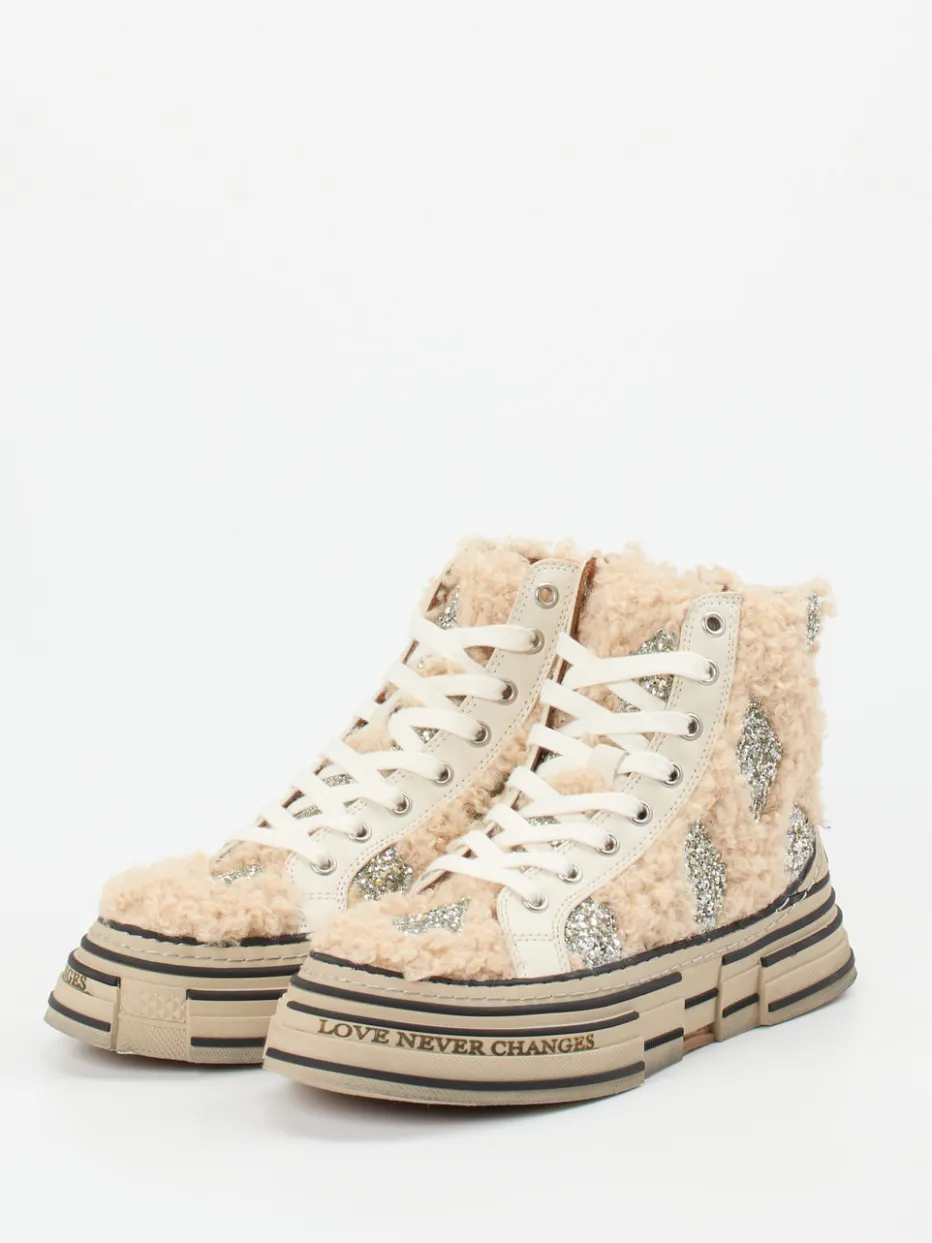 Dieser High-Top-Sneaker vereint flauschige Teddyfell-Textur mit schimmernden Glitzerakzenten und trendiger Plateausohle – ideal für individuelle Streetstyle-Statements.