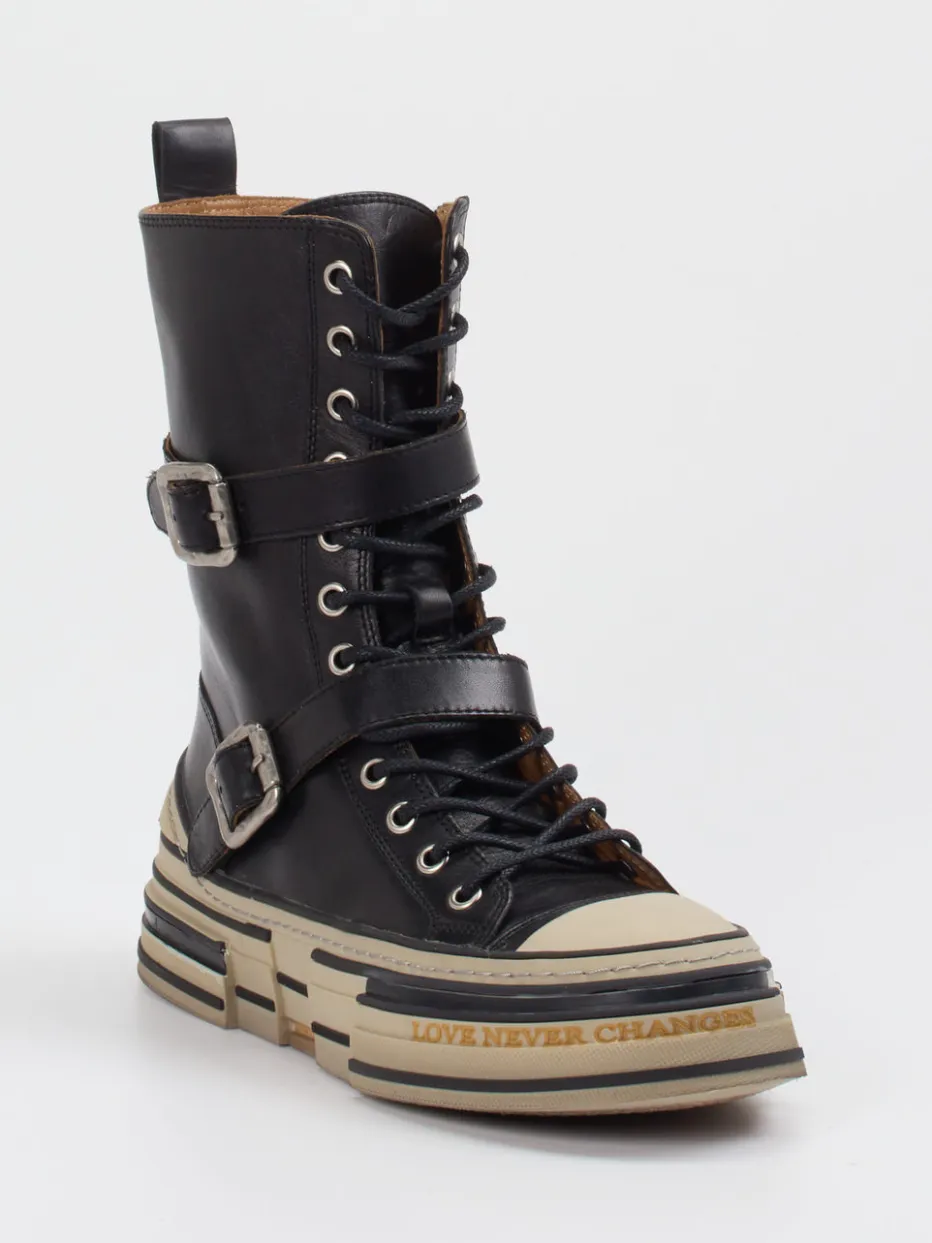 Chunky Design trifft Streetstyle-Coolness.Rebecca White zeigt mit diesem schwarzen Schnürboot eine stilsichere Verbindung aus Modernität und Ausdruck. Für spontane City-Ausflüge oder lange Nächte sorgt das weiche Lammleder in matter Optik für angenehmen Tragekomfort. Metallschnallen, ein seitlicher Reißverschluss und silberfarbene Ösen betonen die edgy Konstruktion, während die kontrastreich gestreifte Gummisohle mit Statement-Schriftzug ein echter Blickfang bleibt. Die chunky Silhouette mit gepolsterter, herausnehmbarer Innensohle rundet den Look funktional ab. Als modischer Akzent zu Cargohose oder oversized Hoodie bestens geeignet. Ein Statement-Boot mit maximalem Stilwert und markentypischer Detailfreude.