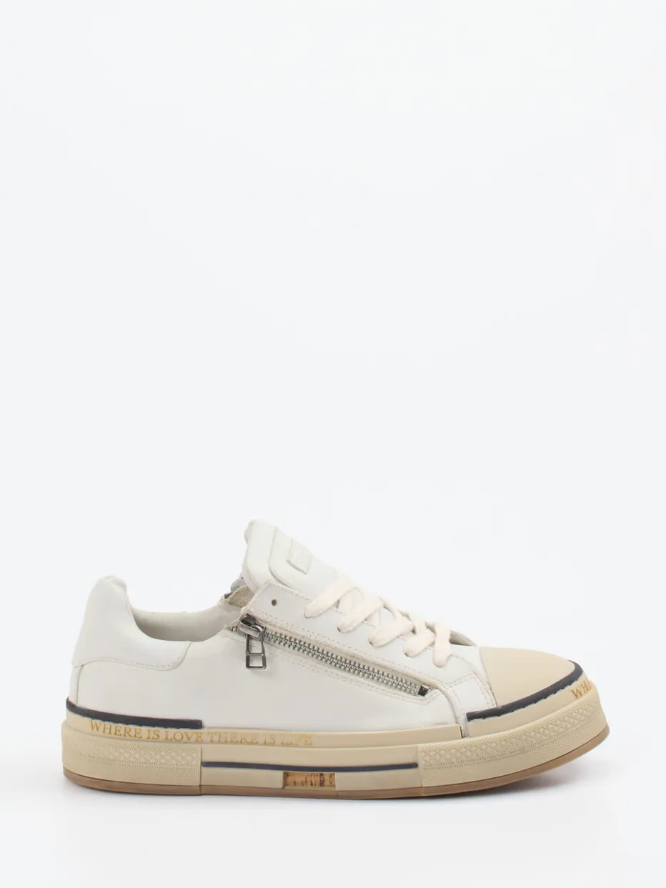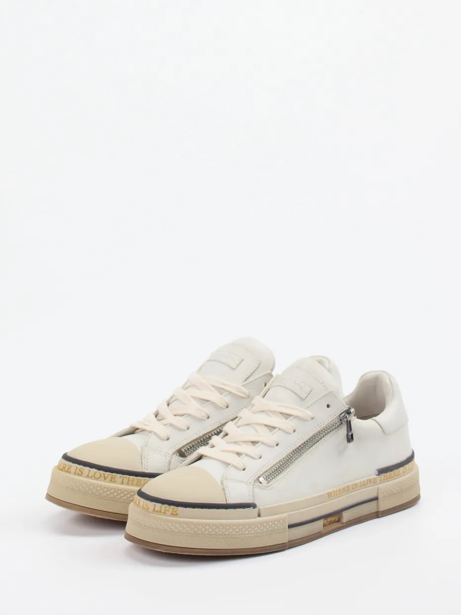 Für stilbewusste Tage in der Stadt bietet dieser cremeweiße Sneaker dank seitlichem Reißverschluss und gepolstertem Innenleben funktionalen Komfort. Die matte Lederoberfläche, kombiniert mit einer schwarzen Profilsohle und goldgeprägtem Schriftzug, bringt den Typografie-Trend auf die Straße. Der Mix aus Schnürung und Reißverschluss unterstreicht den streetwear-inspirierten Look. Ideal zu neutralen Streetstyle-Outfits oder als Kontrast zu femininen Pieces.