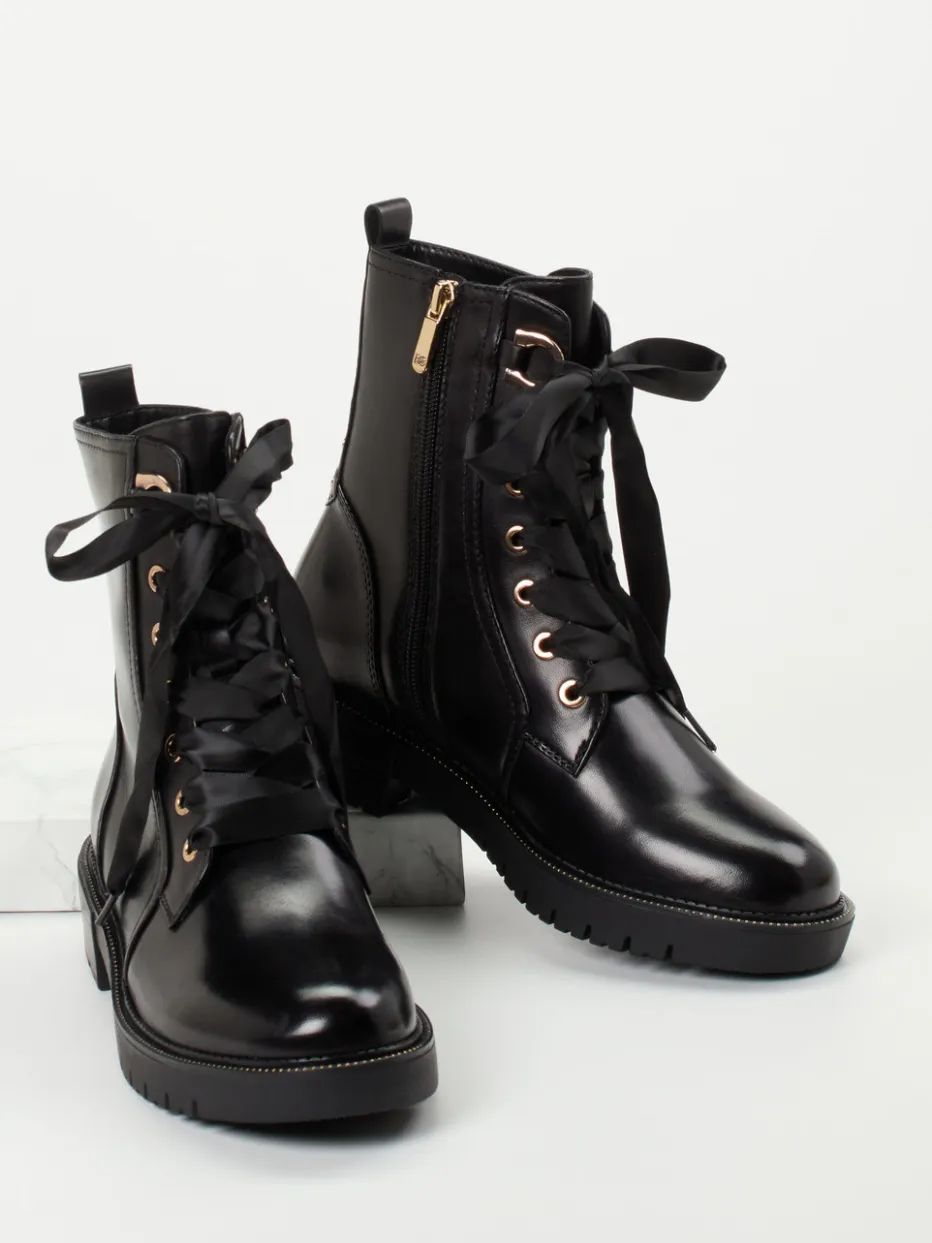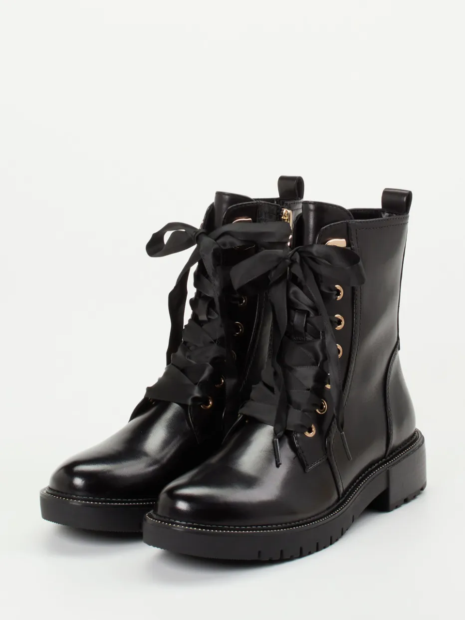 Hochwertiges Kalbleder trifft auf feminine Satin-Schnürung und Utility-inspirierte Details – ein Statement für urbane Looks.