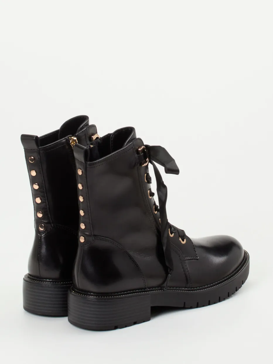 Stark im Stil: Schwarze Schnürboots im Premium-Look.Regarde Le Ciel interpretiert die klassische Damen-Schnürstiefelette neu. Diese glänzenden Schnürboots aus schwarzem Kalbleder verbinden robustes Streetwear-Flair mit femininem Twist. Die breiten Satinbänder kontrastieren elegant zu goldfarbenen Ösen und Ziernieten an der Ferse. Ein Reißverschluss an der Seite erleichtert das Anziehen, während das weiche Microfaserfutter angenehm wärmt. Die profilierte Gummisohle mit 3,5 cm Absatz und 2 cm Plateau sorgt für Stabilität – ideal für City-Touren oder Ausgeh-Abende. Kombinierbar mit Lederjacke oder Strickkleid für einen ausdrucksstarken Herbststil. Hochwertige Verarbeitung und trendbewusstes Design – typisch Regarde Le Ciel.