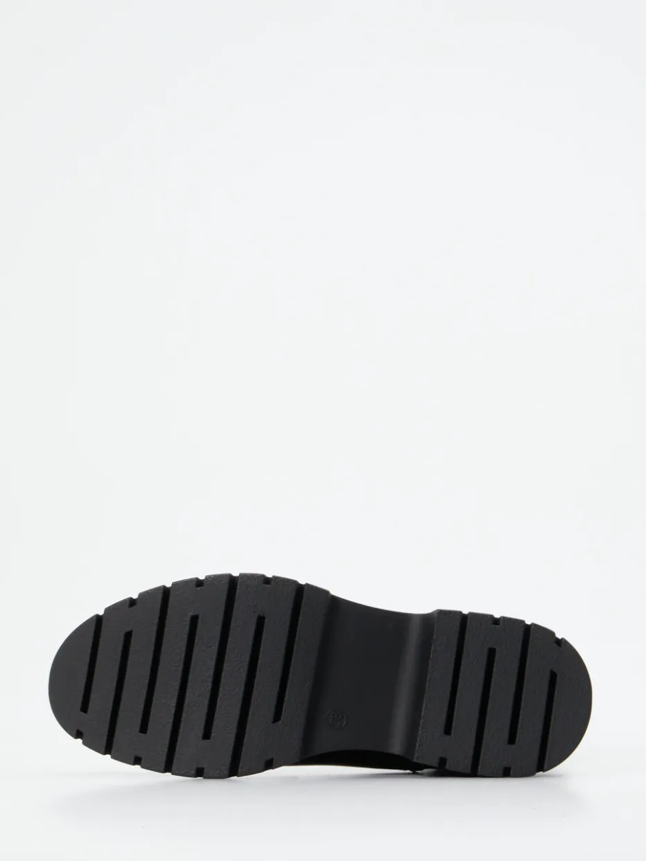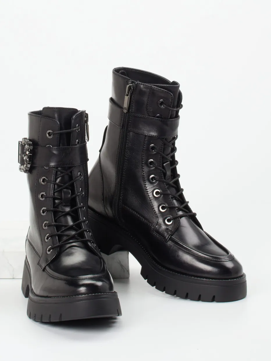 Glänzendes Lammleder und eine strassbesetzte Schnalle setzen ein modisches Statement mit Charakter – stilvoll akzentuiert vom robusten Chunky-Design und urbaner Funktionalität.