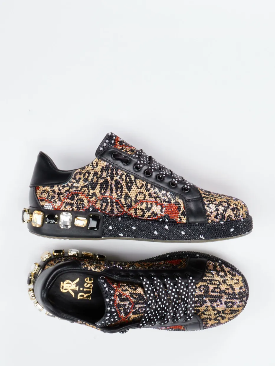 Der klassische Low-Top-Sneaker von Rise verbindet glänzendes Metallicleder mit auffälligem Animalprint und präzisem Strassbesatz. Glamoröse Details machen ihn zum Highlight moderner Streetstyles.