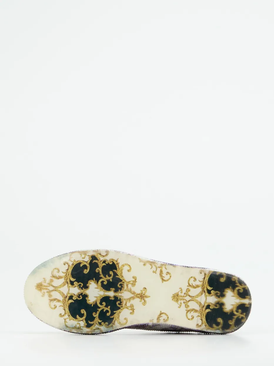 Funkelnder Statement-Sneaker mit barockem Twist.Die Marke Rise präsentiert mit diesem Sneaker ein expressives Modell für den Alltag und festliche Gelegenheiten. Die Kombination aus mehrfarbigem Metallicleder, samtigem Textil und üppigem Strassbesatz ist auffällig und luxuriös zugleich. Goldfarbene Schnürsenkel in Kettenoptik und ein barockes Sohlendekor unterstreichen das extravagante Design. Die rund geschnittene Low-Top-Silhouette mit gepolstertem Schaft bietet angenehme Trageeigenschaften, ergänzt durch ein weiches Kalblederfutter. Ideal für trendbewusste Looks mit maximalistischem Anspruch – zum Beispiel zu schmaler, schwarzer Denim und Gold-Accessoires. Stilsicherer Glanzpunkt mit modischer Strahlkraft von Rise.
