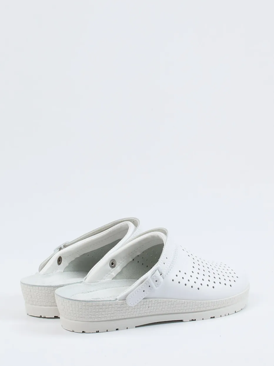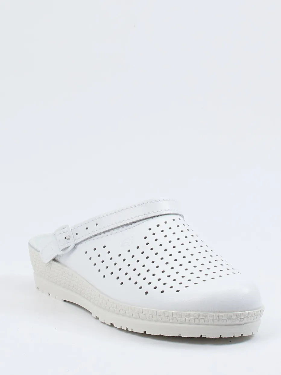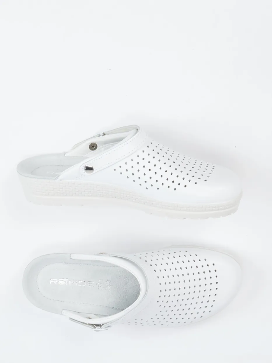 Unkomplizierter Komfort für Arbeit und Alltag.Die Marke Rohde präsentiert mit diesem Clog einen funktionalen Begleiter für Berufs- und Entspannungsmomente. Für langes Stehen oder den Einsatz im Arbeitsumfeld ausgestattet, überzeugt das Modell aus weißem Kalbleder mit einer fein perforierten Oberfläche, matter Anmutung und ergonomischem Fußbett. Die klassische Silhouette mit offenem Fersenbereich und individuell verstellbarem Fersenriemen bietet ein komfortables Tragegefühl. Eine profilierte PU-Sohle mit leichter Keilform schafft sicheren Halt. Das Design ist inspiriert von minimalistischen Stilrichtungen und wird unter Clean-Uniformity-Trends eingeordnet. Passt hervorragend zu medizinischer Arbeitskleidung oder cleanen Loungewear-Looks. Rohde setzt auf langlebige Materialien und klare Funktionalität mit dezentem Stilanspruch.