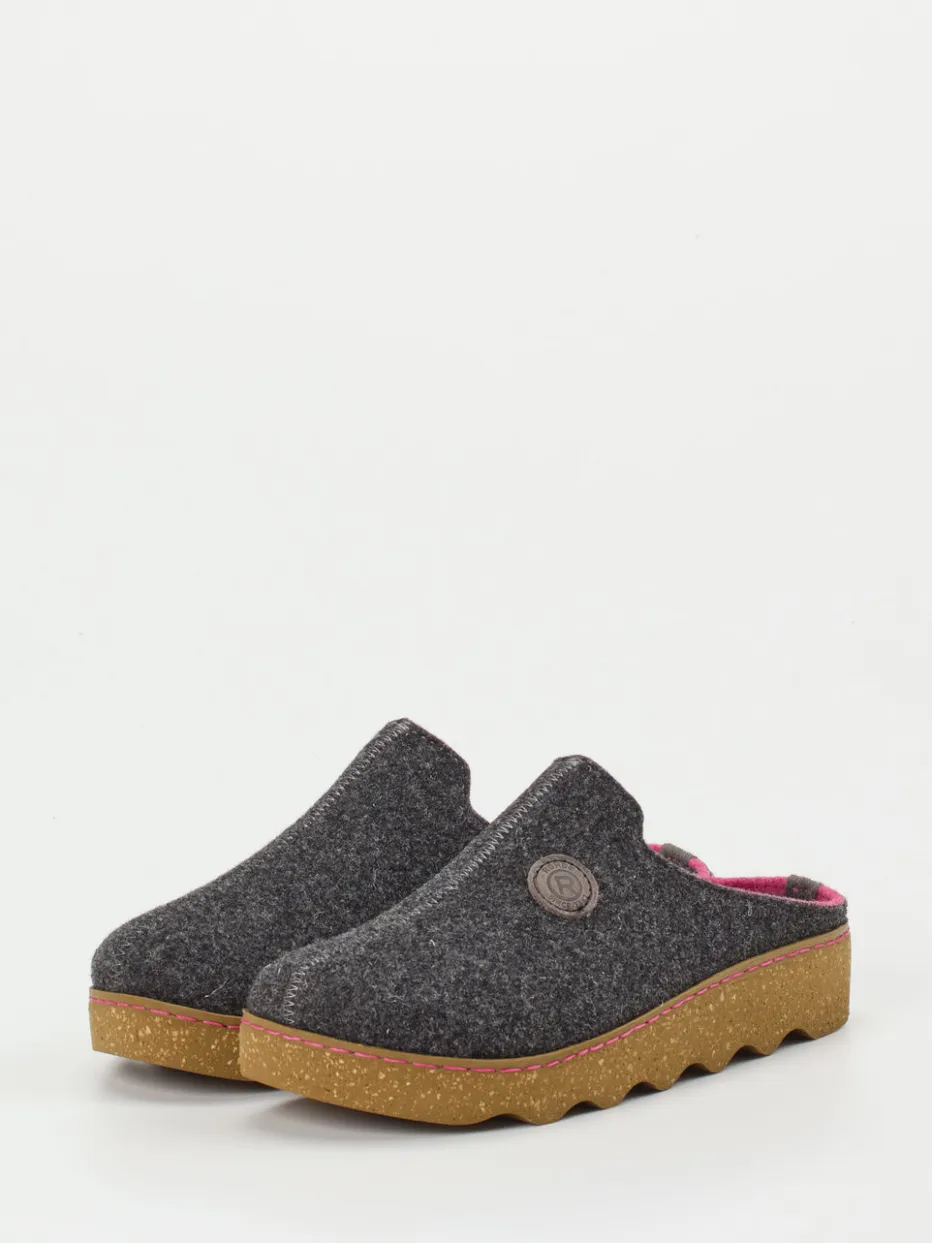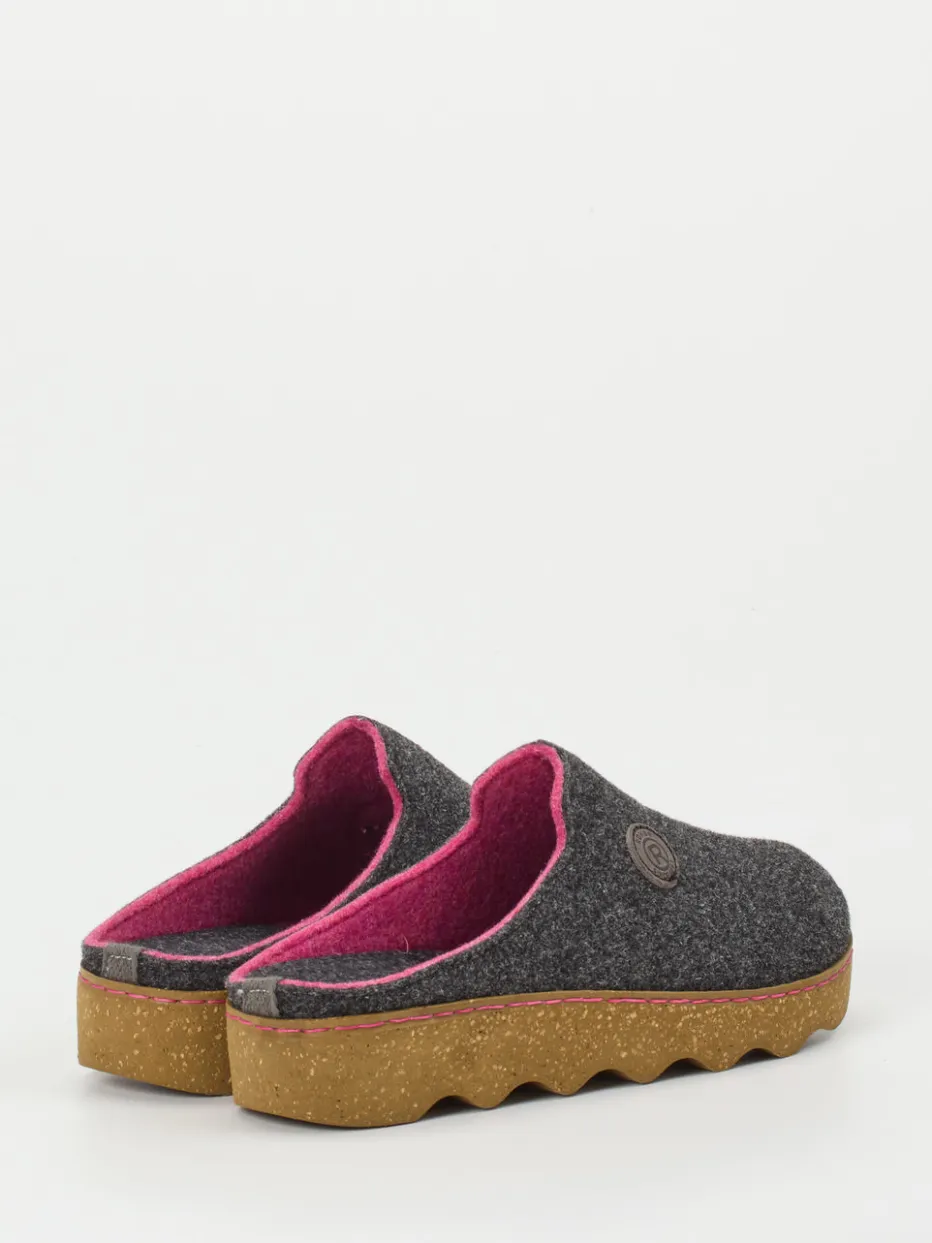 An kühlen Tagen schenkt der weiche, meliert strukturierte Filz in Anthrazit angenehme Wärme. Das auffallend pinke Innenfutter und die ergonomisch geformte Kunststoffsohle in Korkoptik bilden moderne Kontraste. Durch die offene Fersenpartie in bequemer Schlupfform bietet dieses Modell unkomplizierten Einstieg und hohen Tragekomfort. Geprägte Logos sowie pinkfarbene Kontrastnähte setzen dezente Marken-Highlights. Der Schuh fügt sich mühelos in den Trend „Quiet Luxury“ ein und passt ideal zu Fleece-Hausanzügen oder Kuschelsocken.