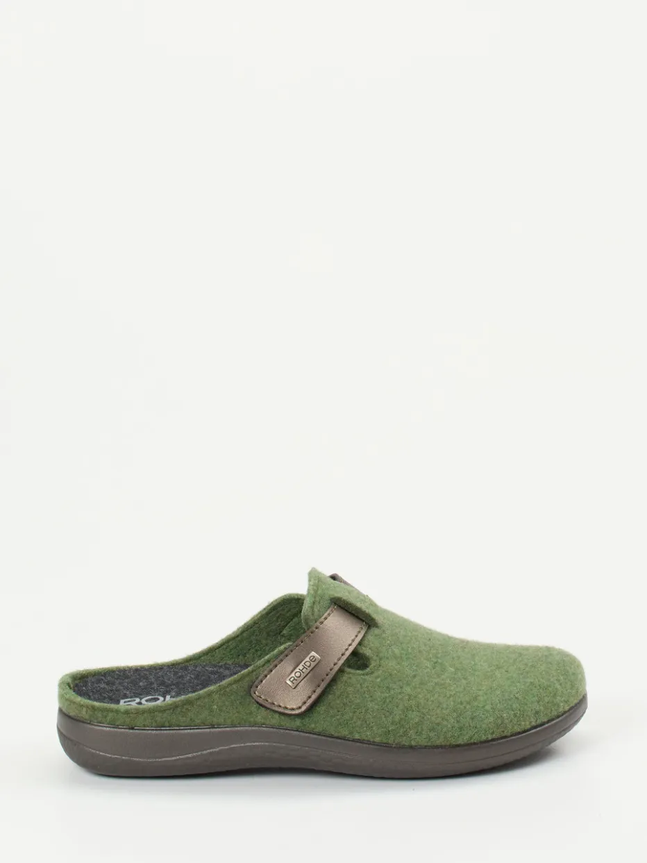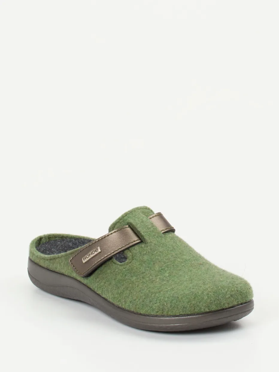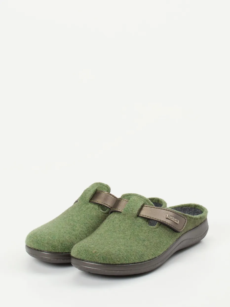 Die moosgrünen Rohde-Pantoffeln vereinen natürliches Filzmaterial mit ergonomischer Sohle und durchdachter Passform – ideal für den entspannten Alltag zu Hause.