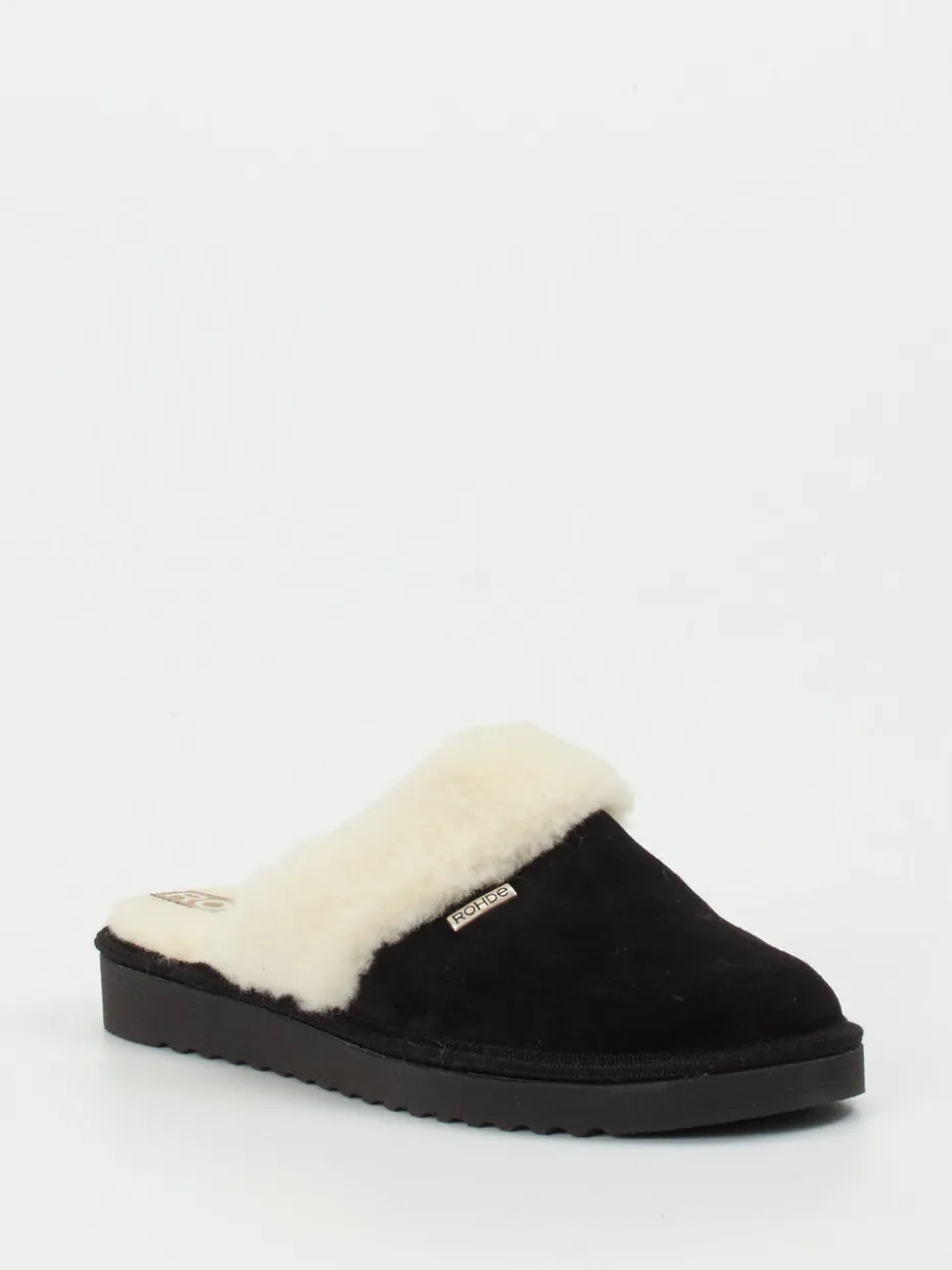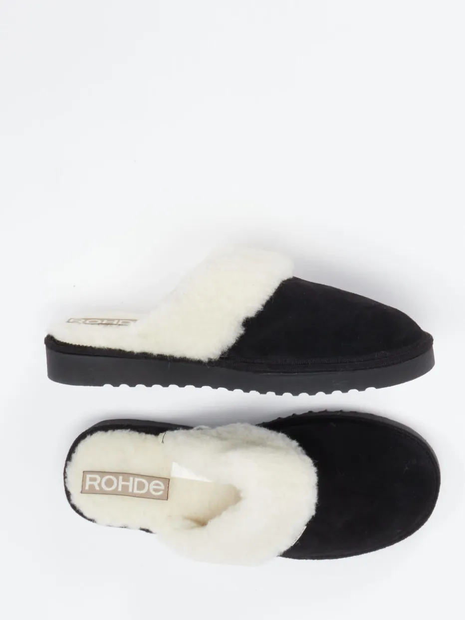 Wärme trifft auf minimalistischen Stil.Rohde präsentiert komfortorientierte Damenpantoffeln für entspannte Stunden zu Hause. Wenn Zuhause zur Wohlfühloase wird, überzeugen diese Hausschuhe mit hochwertigem Lammleder, samtig matt gearbeitet. Das tiefschwarze Obermaterial trifft auf cremefarbenen Kragen aus echter Schurwolle und schafft dezente Kontraste. Die geschlossene Front und der offene Fersenbereich unterstreichen das klare, funktionale Design. Innen bietet das kuschelige Textilfutter angenehme Wärmezufuhr, während die profilierte Gummisohle auch kurze Wege nach draußen ermöglicht. Dezente Logo-Details runden das Erscheinungsbild ab. Ideal zu flauschiger Loungewear und Kaschmirkleidung. Rohde steht für langlebigen Tragekomfort mit klarem Stilanspruch.