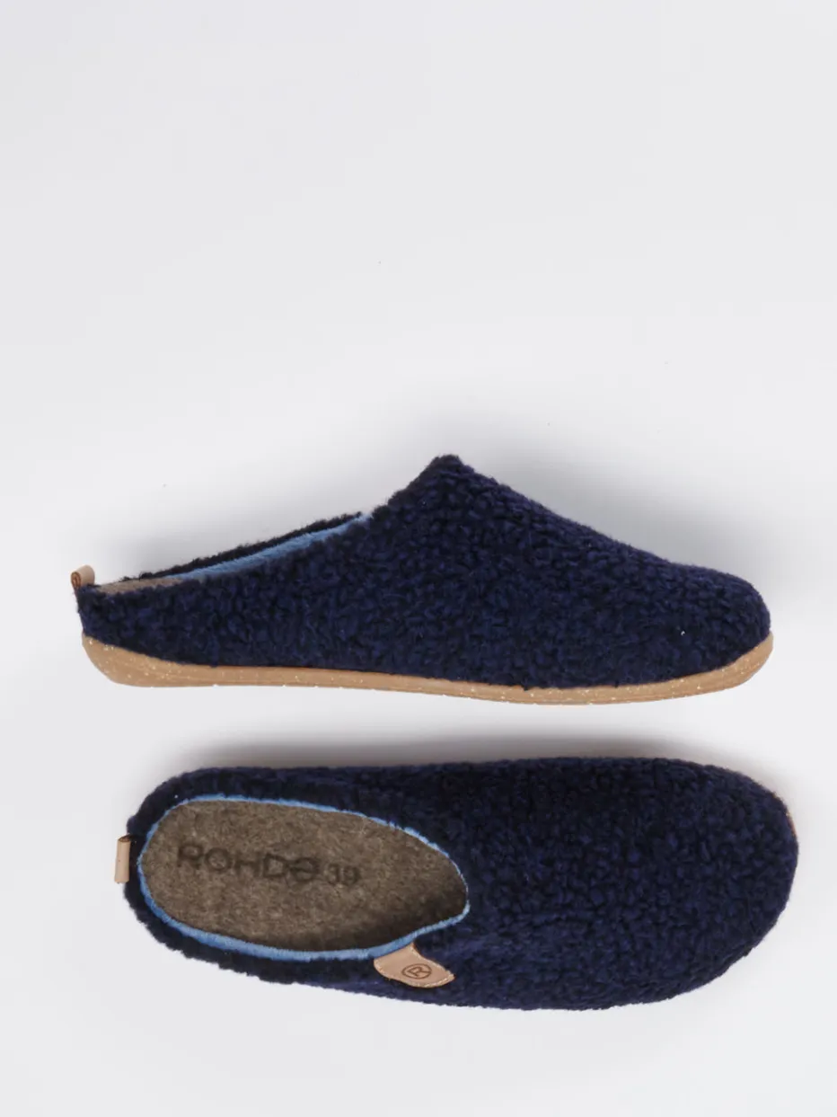 Kuscheliger Komfort für gemütliche Wintertage.Rohde präsentiert mit diesen Pantoffeln ein stilvolles Modell für Damen und Herren. Wenn der Alltag nach Erholung verlangt, bieten diese Hausschuhe mit weichem Teddyfleece-Obermaterial das perfekte Tragegefühl. Die nachtblaue Oberfläche trifft auf ein hellblaues Plüschfutter und verspricht angenehme Wärme. Die offene Fersenpartie ermöglicht einen schnellen Einstieg, während die gesprenkelte Gummisohle mit Markenprägung rutschhemmenden Halt liefert. Akzente wie der kontrastfarbene Logo-Patch setzen dezente Markenstatements. Inspiriert vom Hygge-Trend passen sie perfekt zu Loungewear oder flauschigen Hausanzügen. Ein Hausschuh mit Fokus auf Geborgenheit – klar, funktional und komfortorientiert.