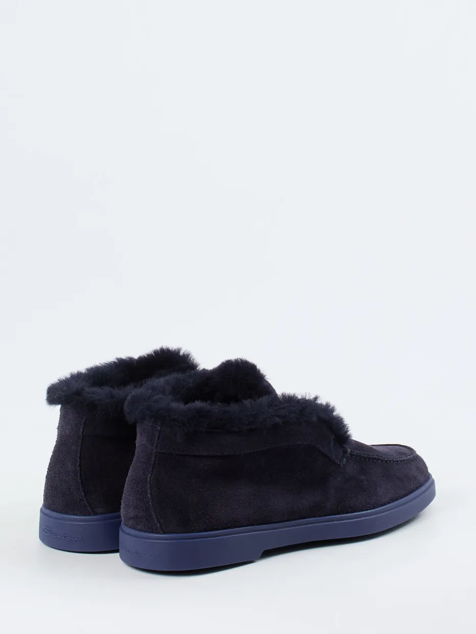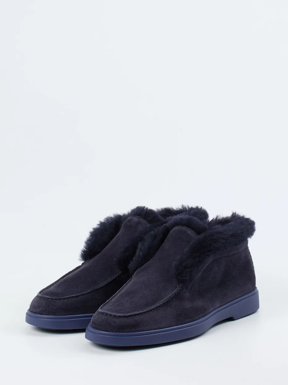 Ideal für kalte Tage daheim spendet das dunkelblaue Veloursleder mit mattierter Optik angenehme Wärme. Das samtige Lammfellfutter sorgt für ein weiches Tragegefühl, während die klassische, rund geformte Silhouette sowie Ton-in-Ton-Nähte dezenten Minimalismus vermitteln. Die kontrastfarbene Gummisohle mit rutschhemmendem Profil sichert Stabilität auf glatten Böden. In Schlupfform gearbeitet, passt der Schuh perfekt zu lässiger Loungewear oder einem hochwertigen Hausanzug.