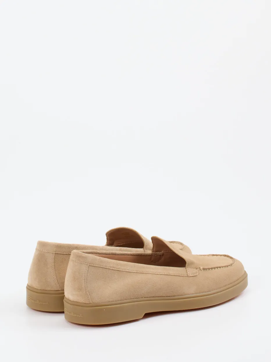 Eleganz, die Alltag kann.Santoni präsentiert diesen handwerklich ausgearbeiteten Damen-Loafer aus feinstem Veloursleder. Für entspannte Office-Tage oder stilvolle City-Streifzüge bietet das beigebraune Modell mit seiner flach-klassischen Silhouette eine geschmackvolle Basis. Gefertigt aus hochwertigem Veloursleder mit samtig matter Oberfläche, ergänzt durch tonige Mokassin-Nähte und eine weich gepolsterte Decksohle mit Lederfutter aus Lammnappa. Die orangefarbene Gummisohle im Profil gibt rutschfeste Sicherheit und einen modischen Akzent im „Quiet Luxury“-Stil. Ideal zu hellen Stoffhosen oder klassischen Cognac-Accessoires im Smart-Casual-Look. Dezente Formensprache trifft auf kompromisslosen Komfort – typisch Santoni.