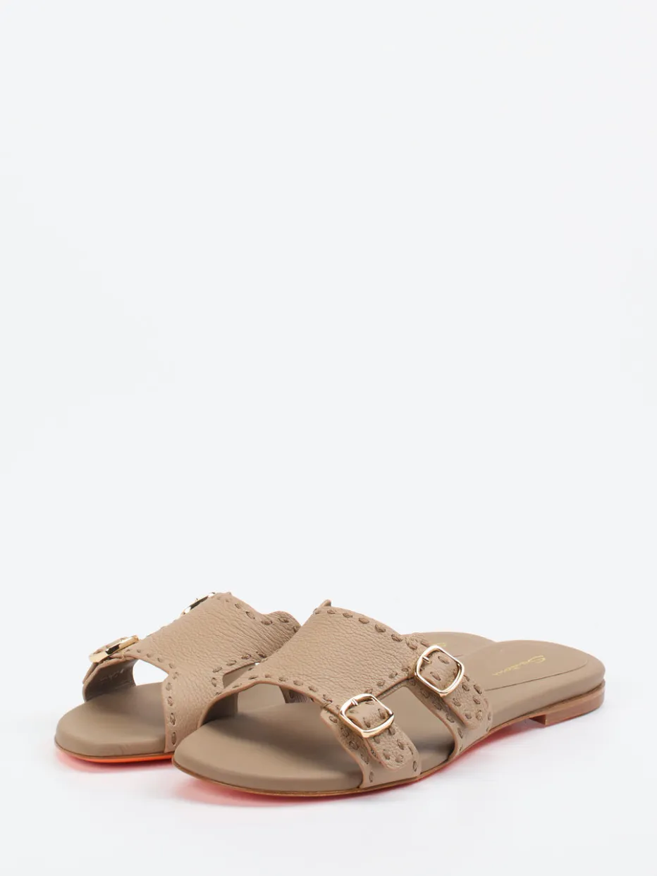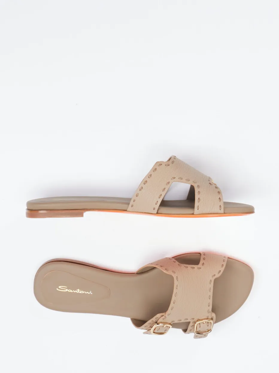 Minimalismus trifft sommerliche Raffinesse.Die italienische Marke Santoni präsentiert mit dieser Damen-Slide ein hochwertiges Modell aus Kalbleder. Ideal für entspannte Tage in der Stadt oder auf Reisen bietet diese flache Pantolette ausgezeichneten Tragekomfort. Das genarbte Leder in warmem Beigebraun wird von zwei Riemen mit goldfarbenen Schnallen betont. Die ikonisch orangefarbene Ledersohle verleiht dem Design ein visuelles Highlight. Inspiriert von Quiet Luxury und Soft-Neutrals-Trends passt das Modell perfekt zu einer minimalistischen Sommergarderobe – etwa mit Leinenhosen oder Naturtönen kombiniert. Feinste Verarbeitung und Designkompetenz – typisch Santoni.