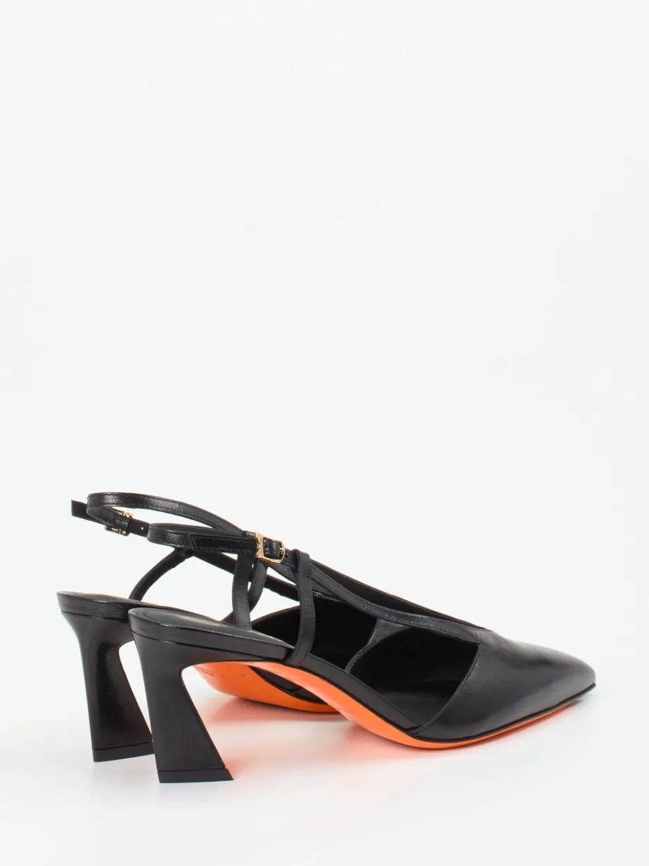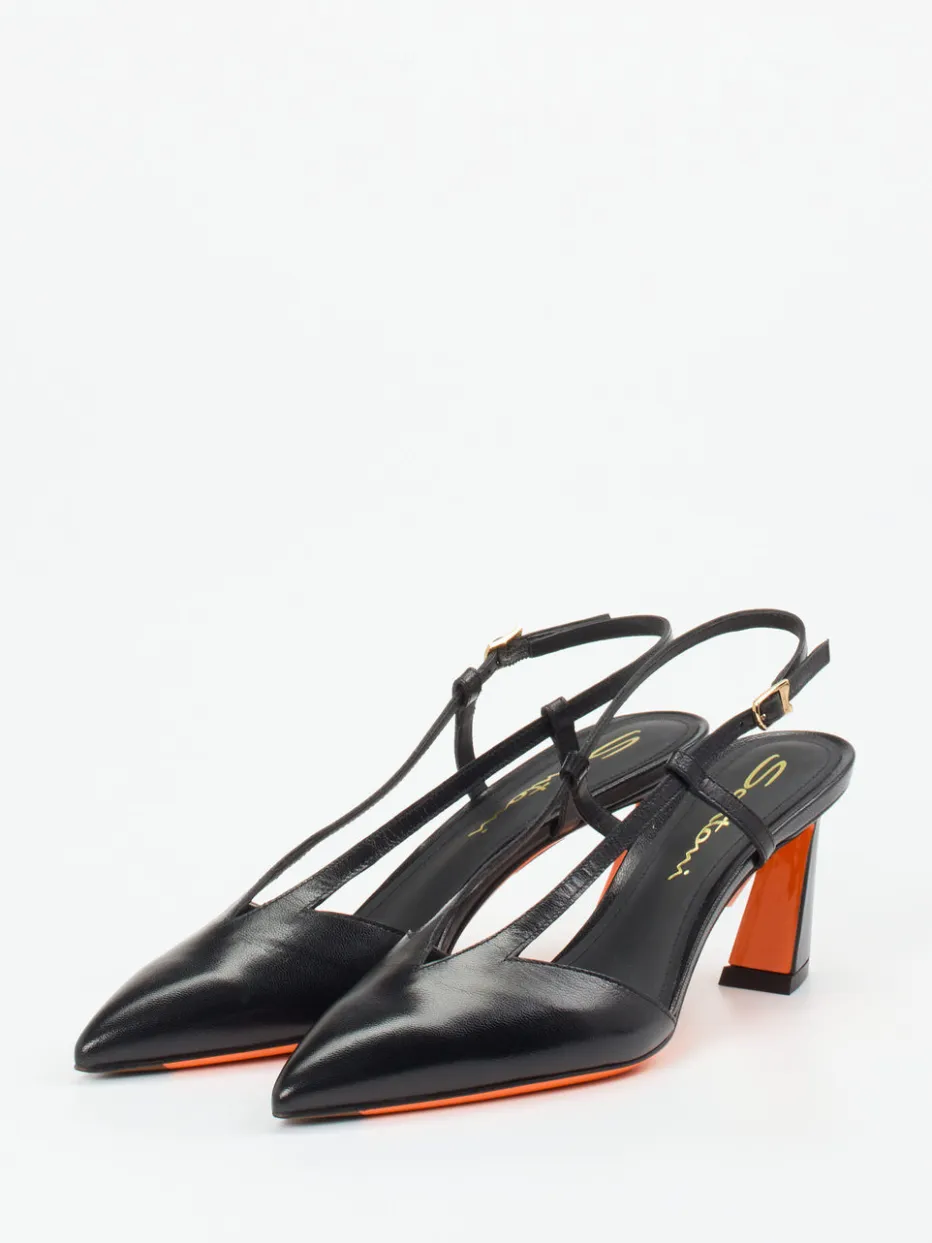 Kontrastvolle Eleganz auf hohem Niveau.Santoni interpretiert die klassische Kategorie der Damenpumps mit einem designstarken Slingback-Modell neu. Ein idealer Begleiter für abendliche Events oder festliche Anlässe: Diese spitz zulaufenden Pumps aus schwarzem Kalbleder mit glänzender Oberfläche inszenieren Eleganz mit einem avantgardistischen Akzent. Der Blockabsatz mit orangefarbener Innenseite und die farblich abgesetzte Sohle sorgen für eine starke visuelle Präsenz. Die goldfarbene Schnalle am Fersenriemen unterstreicht die hochwertige Verarbeitung. Inspiriert von High Fashion und Color-Blocking-Trends der Saison. Kombiniert mit Seidenkleid oder monochromen Statement-Pieces entfaltet das Modell seine volle Wirkung. Ein Designobjekt mit charakterstarkem Stilprofil aus dem Hause Santoni.