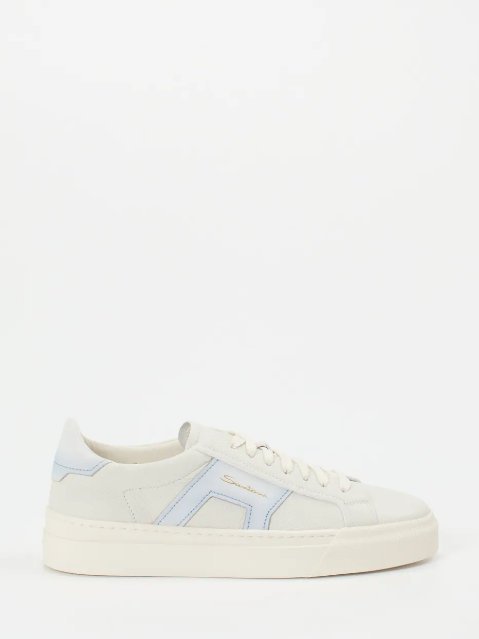 Dieser Sneaker der Luxusmarke Santoni überzeugt in der Damenkategorie durch klare Formsprache und feines Material. Das cremeweiße Lammleder, samtig genarbt, sorgt für einen wertigen Auftritt – ergänzt durch hellblaue Kontrastbesätze und ein filigranes, goldfarbenes Logowording. Die flache Silhouette mit klassischer Schnürung unterstreicht den minimalistischen Anspruch; das orangefarbene Logo auf der Gummisohle gilt als stilvoller Akzent. Inspiriert von Streetwear und Quiet Luxury harmoniert das Modell ideal mit leichter Sommermode. Ein Sneaker für stilvolle Reduktion in luxuriöser Verarbeitung.