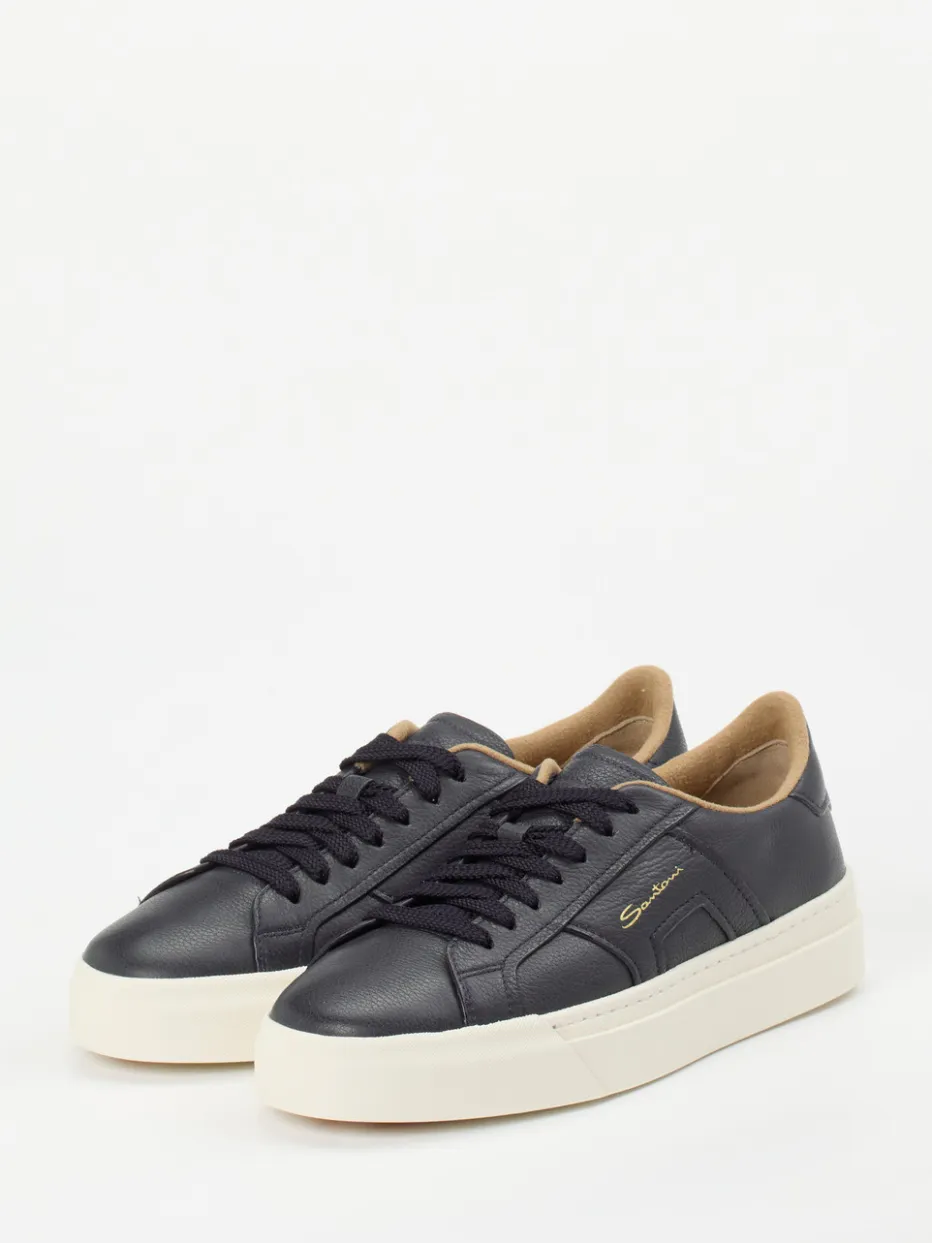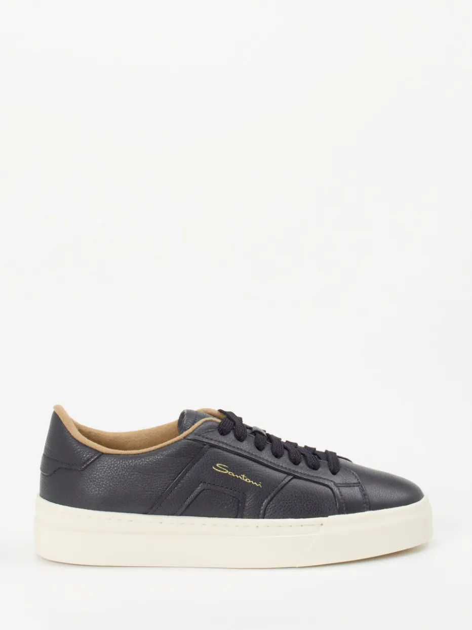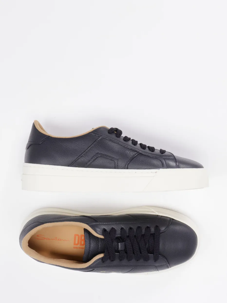 Santoni präsentiert diesen Low-Top-Sneaker aus butterweichem Lammleder in Dunkelblau. Die cleane Silhouette und das dezente Branding verbinden sportiven Komfort mit modernen Designansprüchen.