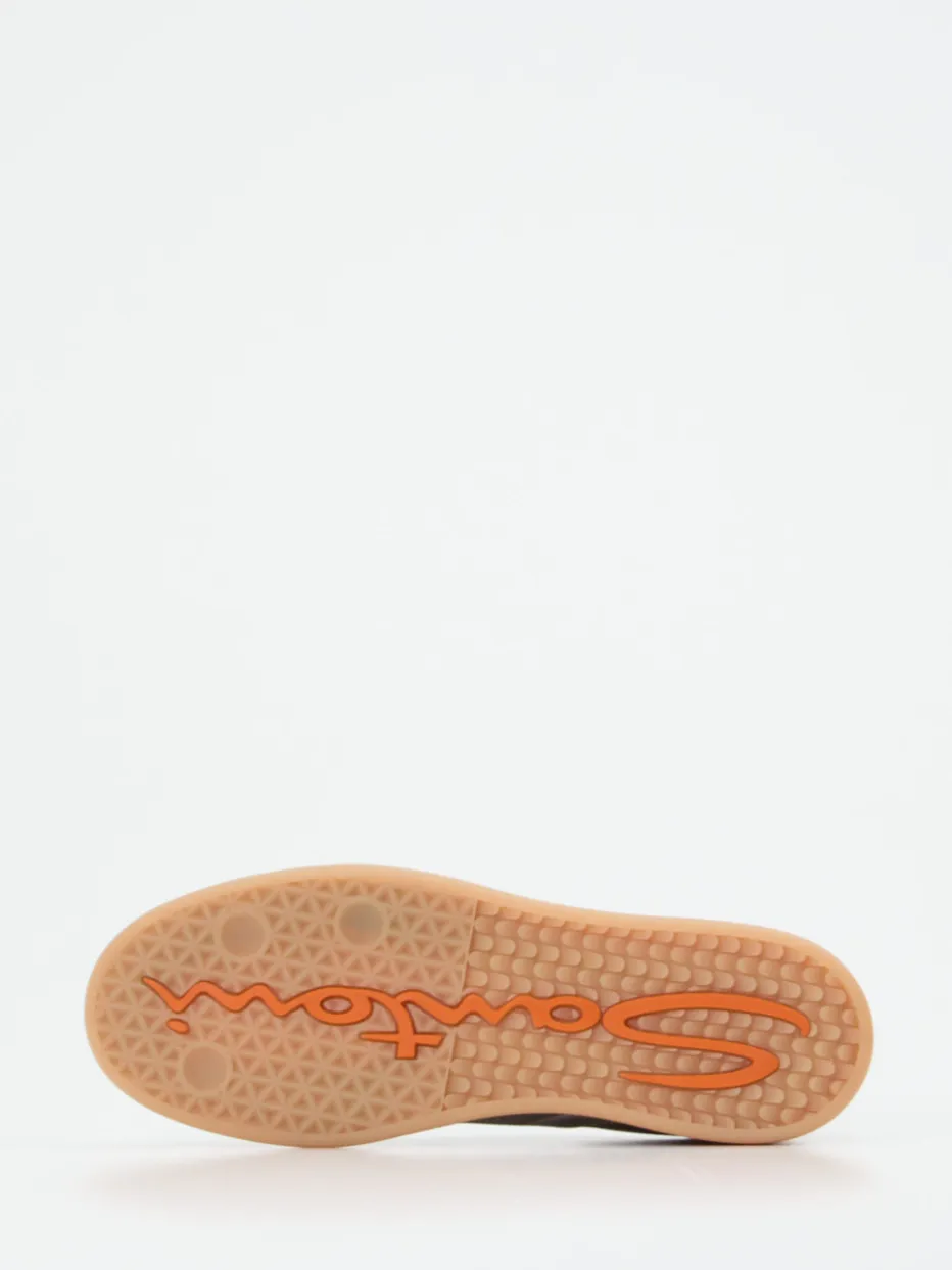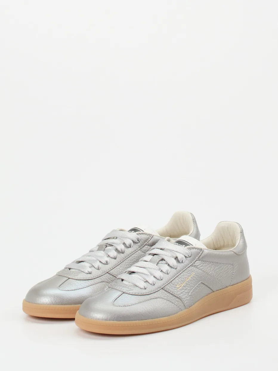 Für entspannte City-Walks oder abendliche Events konzipiert, besticht das Modell durch silbernes Metallicleder mit genarbter Oberfläche, ergänzt durch Ton-in-Ton-Nähte und eine klassische Schnürung. Die flache Silhouette im Stil der Retro-Sportswear trifft auf eine robuste Gumsohle in Hellbraun – ein markanter Kontrast, der den urbanen Look unterstreicht. Eine seitliche Logo-Prägung rundet das Design ab. Ideal zu minimalistischer Streetwear oder monochromen Outfits.