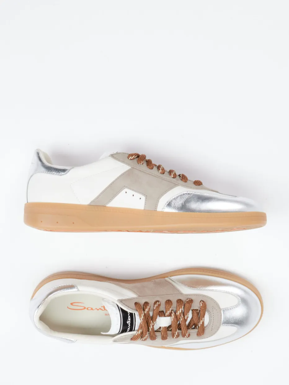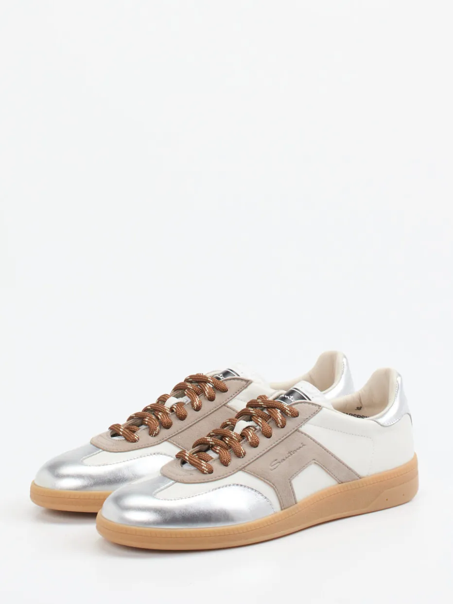 Der Santoni-Sneaker kombiniert Retro-Sportswear mit edlem Materialmix. Metallic-Akzente und Veloursdetails unterstreichen seine moderne Vielseitigkeit.