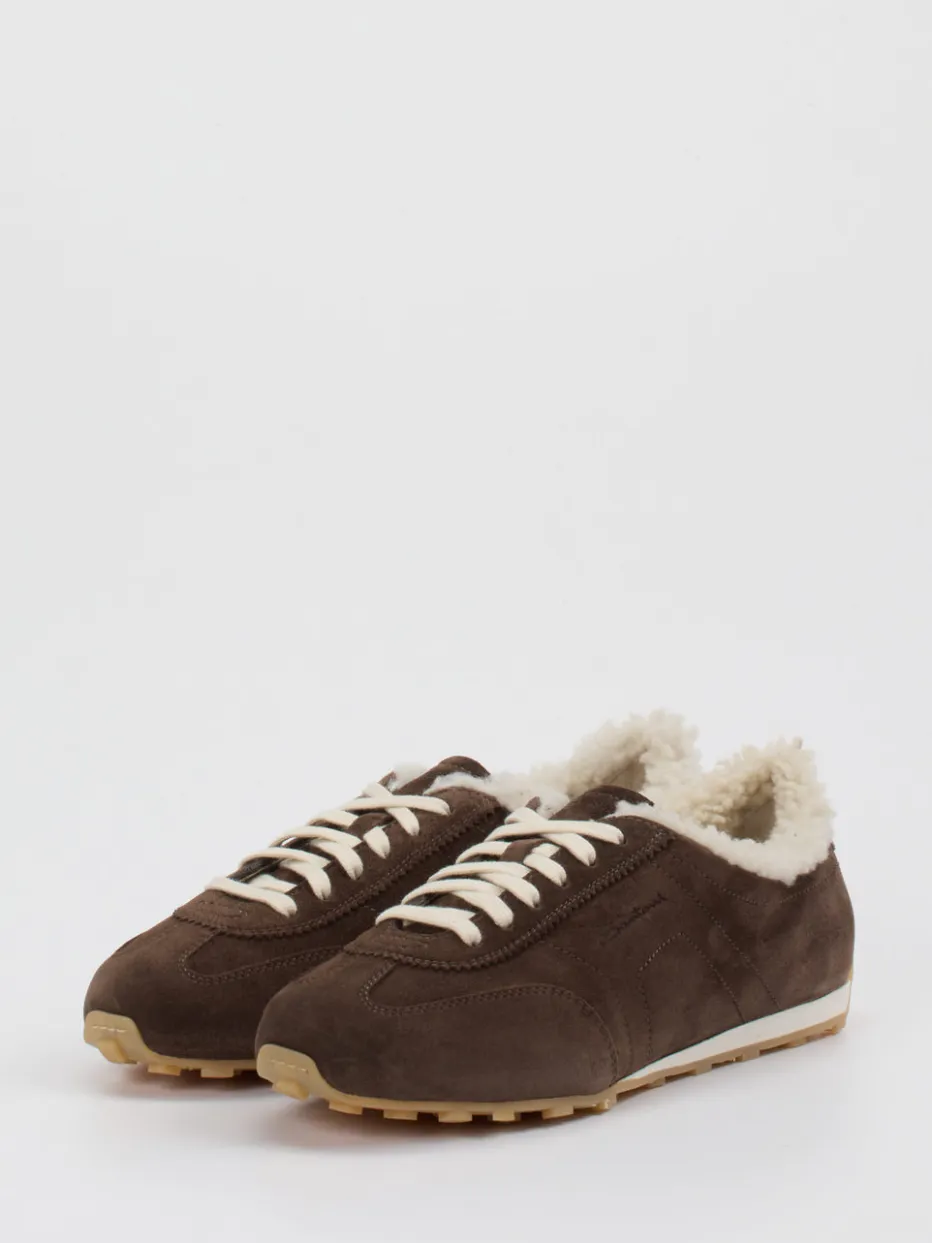 Dieser Sneaker von Santoni vereint hochwertiges Veloursleder mit wärmendem Lammfellfutter – ein stilvoller Begleiter für kalte Tage.