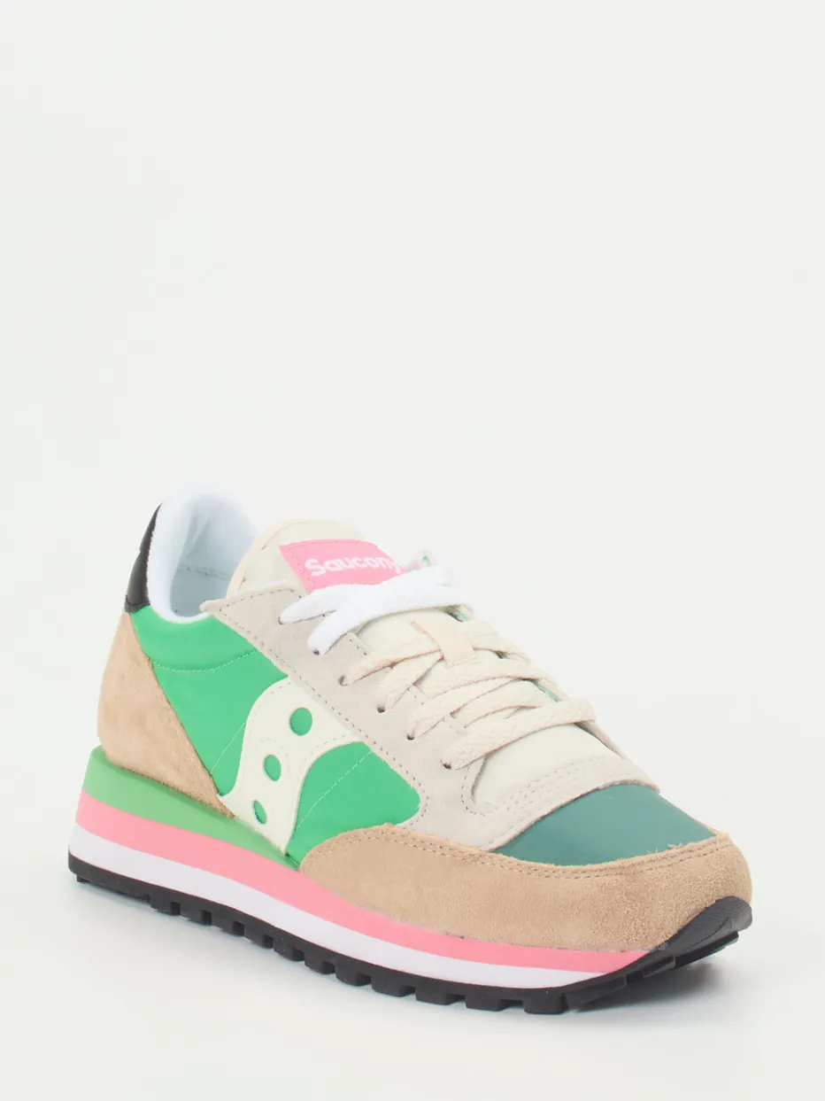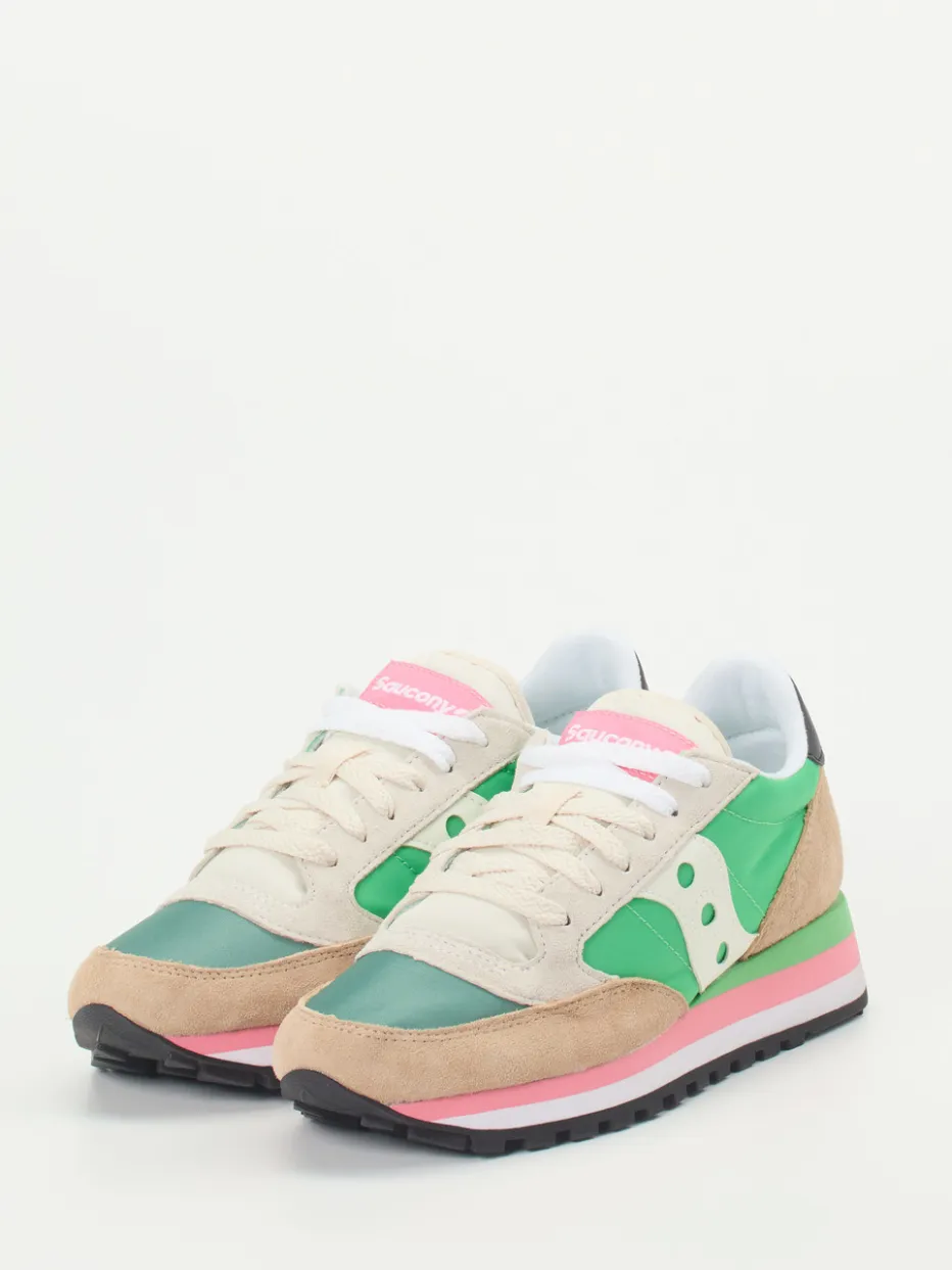Retro trifft Farbkontrast.Saucony bringt mit diesem Sneaker ein Retro-Running-Modell für Alltag und Freizeit auf den Punkt. Die Kombination aus weichem Textilmaterial und samtigem Veloursleder bildet eine spannende Oberfläche. Highlight ist die grasgrüne Farbgrundlage, akzentuiert durch Hellrosa und Beige im Color-Blocking. Die flache Silhouette mit asymmetrischer Schnürung, gepolstertem Schaft sowie stark profilierter Gummisohle vereint Komfort und Style. Logo-Prints auf Zunge und Ferse betonen die Markenidentität. Als stylishes Detail sticht die mehrfarbige Zwischensohle ins Auge – inspiriert vom Y2K-Revival. Ein modischer Sneaker mit markanter Designsprache – typisch Saucony.
