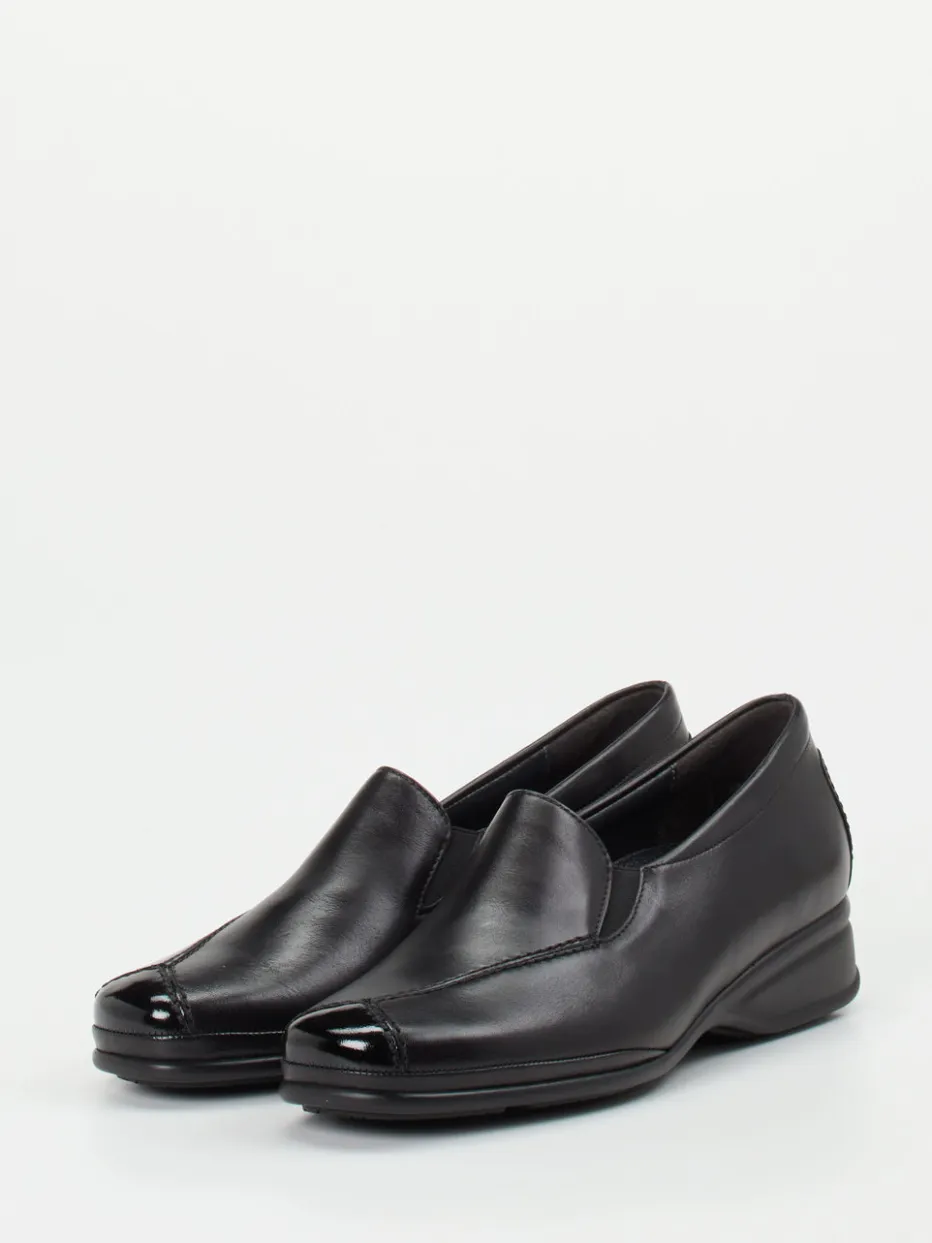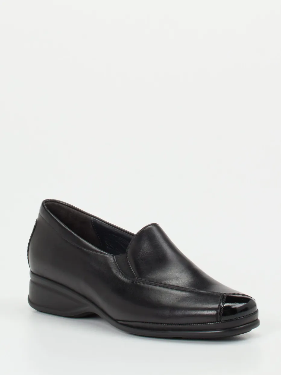 Stillvoll durch den Alltag.Semler präsentiert mit diesem Damen-Bequem-Loafer ein Modell, das Komfort und Design harmonisch verbindet. Ob im Büro oder beim Stadtbummel – dieser hochgeschlossene Slipper erfüllt den Wunsch nach stilvollem Tragekomfort. Gefertigt aus feinem Kalbleder mit samtiger Oberfläche, kombiniert mit glänzendem Lackleder an Spitze und Ferse, überzeugt er durch seine klassische, leicht gerundete Form. Elastikeinsätze erleichtern den Einstieg, während die flexible Luftpolstersohle und das gepolsterte Fußbett für ergonomischen Halt sorgen. Seine tonalen Nähte und die schlichte Silhouette unterstreichen den ruhigen, minimalistischen Charakter. Besonders harmonisch wirkt er zu dunklen Stretchhosen und Ledertaschen. Zeitgemäßer Komfort von Semler mit konsequenter Qualitätsorientierung.