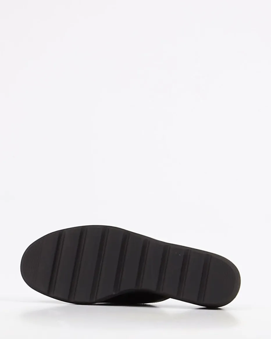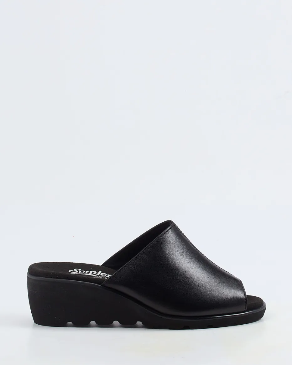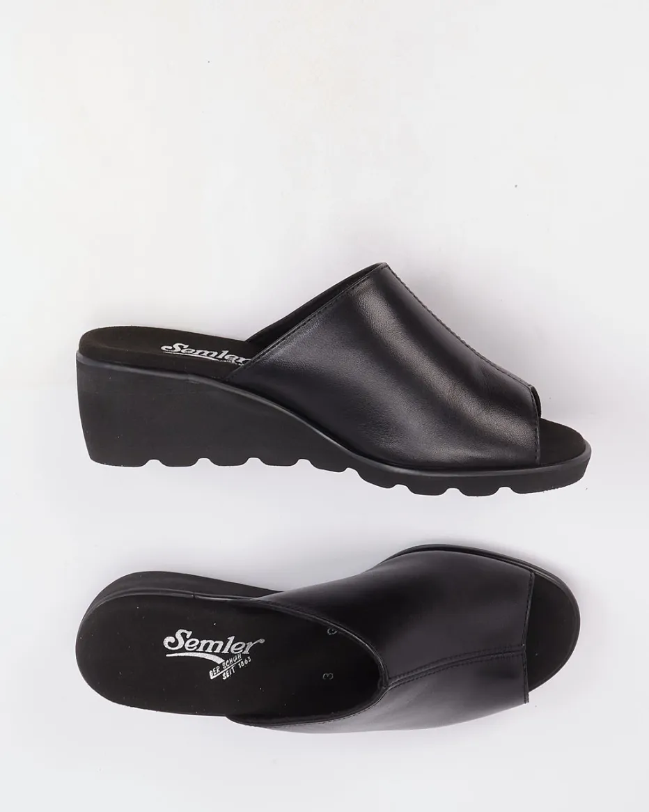 Stilvoller Komfort für entspannte Sommertage.Die Marke Semler präsentiert mit dieser Damen-Pantolette eine elegante Keilabsatz-Variante aus schwarzem Kalbleder. Ideal für den Alltag oder entspannte Momente zu Hause, verbindet das Modell minimalistisches Design mit funktionalem Mehrwert. Das matt wirkende Obermaterial aus Kalbleder trifft auf eine farblich abgestimmte Keilsohle, die durch ihre Porostruktur angenehm leicht ist und für Rutschhemmung sorgt. Die offene Zehenpartie und die gepolsterte Innensohle stehen für sommerlichen Tragekomfort, während die Schlupfform ein unkompliziertes Hineinschlüpfen ermöglicht. Passt ideal zu Leinenhosen und monochromen Looks. Semler bietet hier gehobenen Wohlfühl-Stil mit femininer Silhouette und Alltagstauglichkeit.