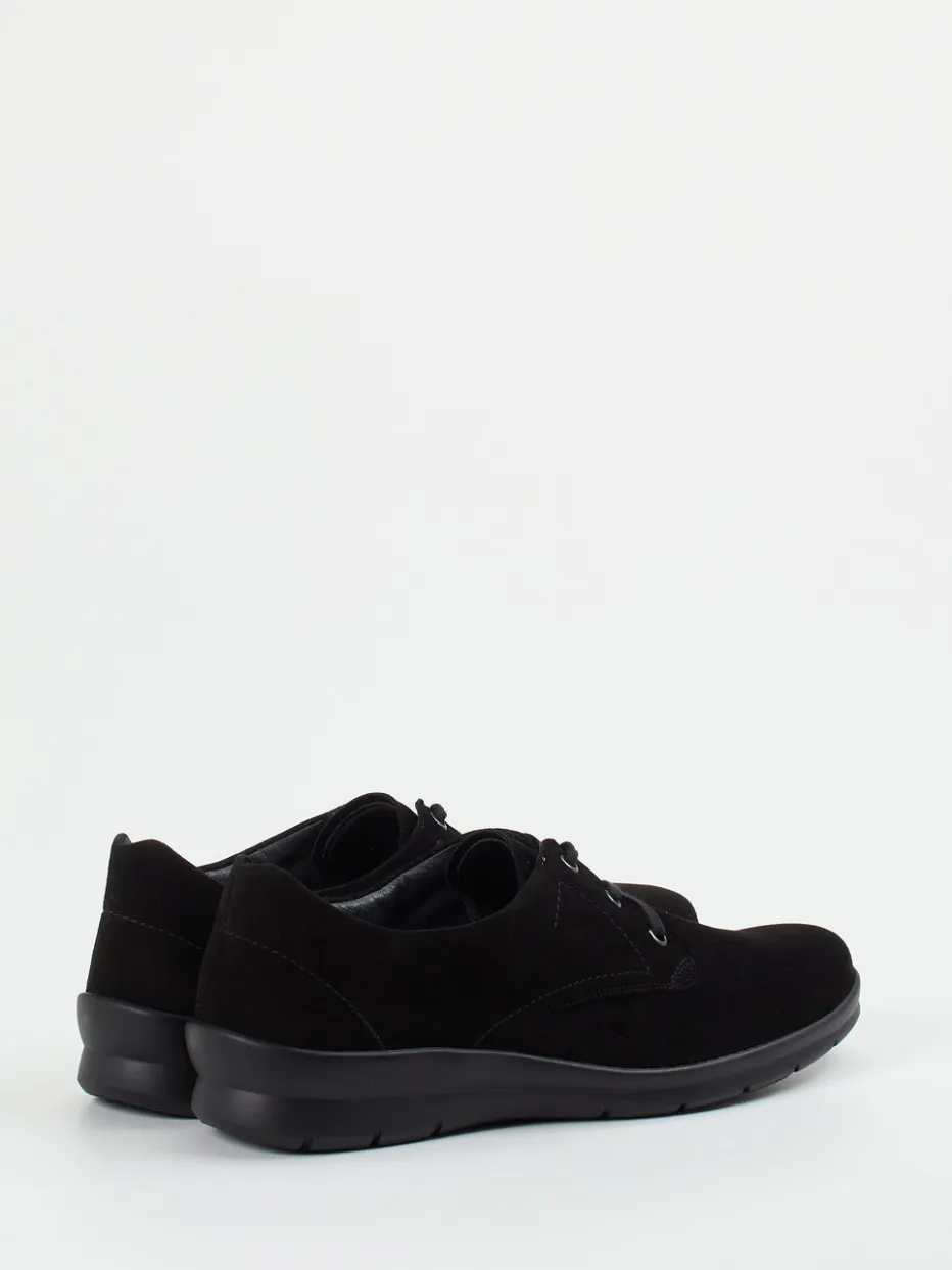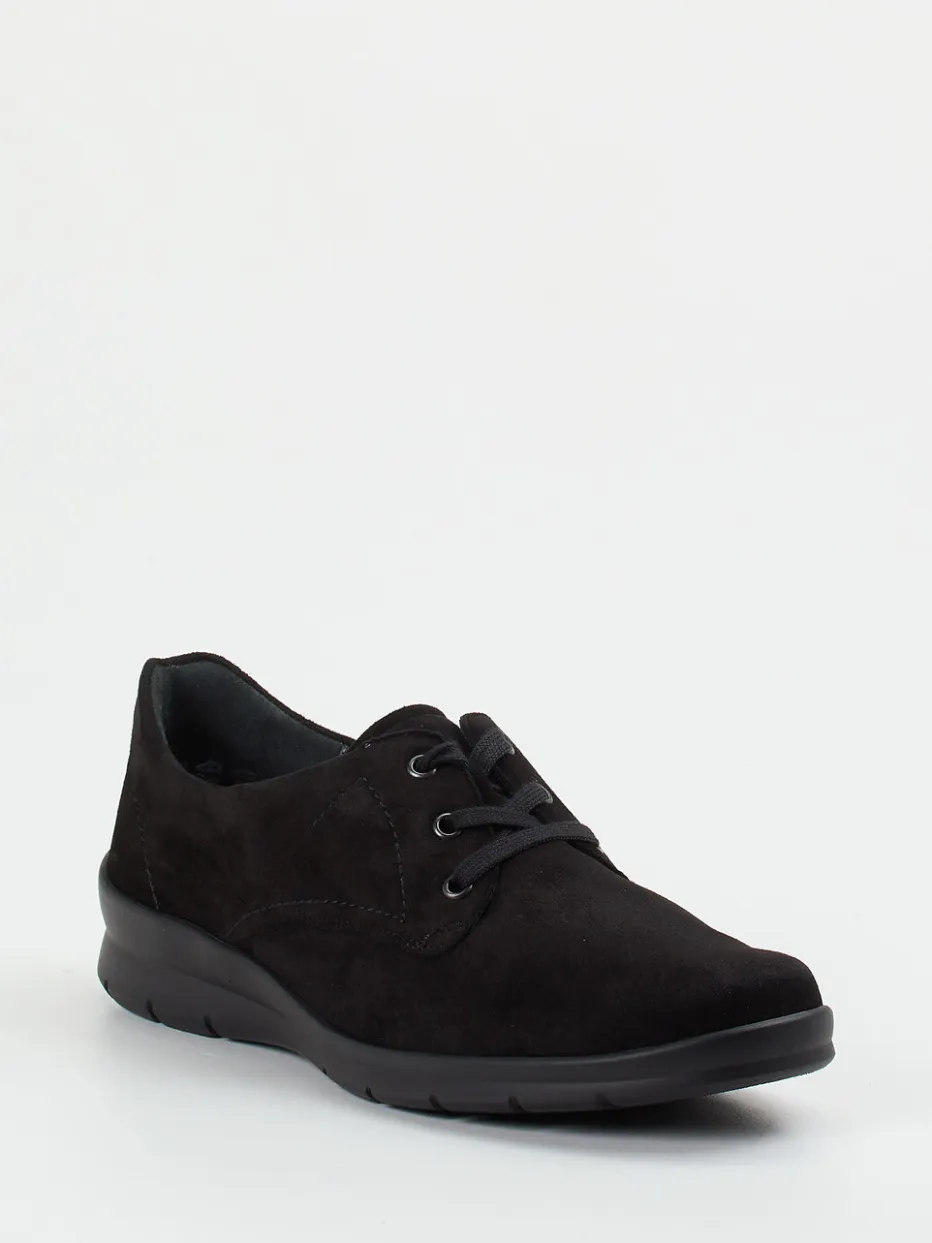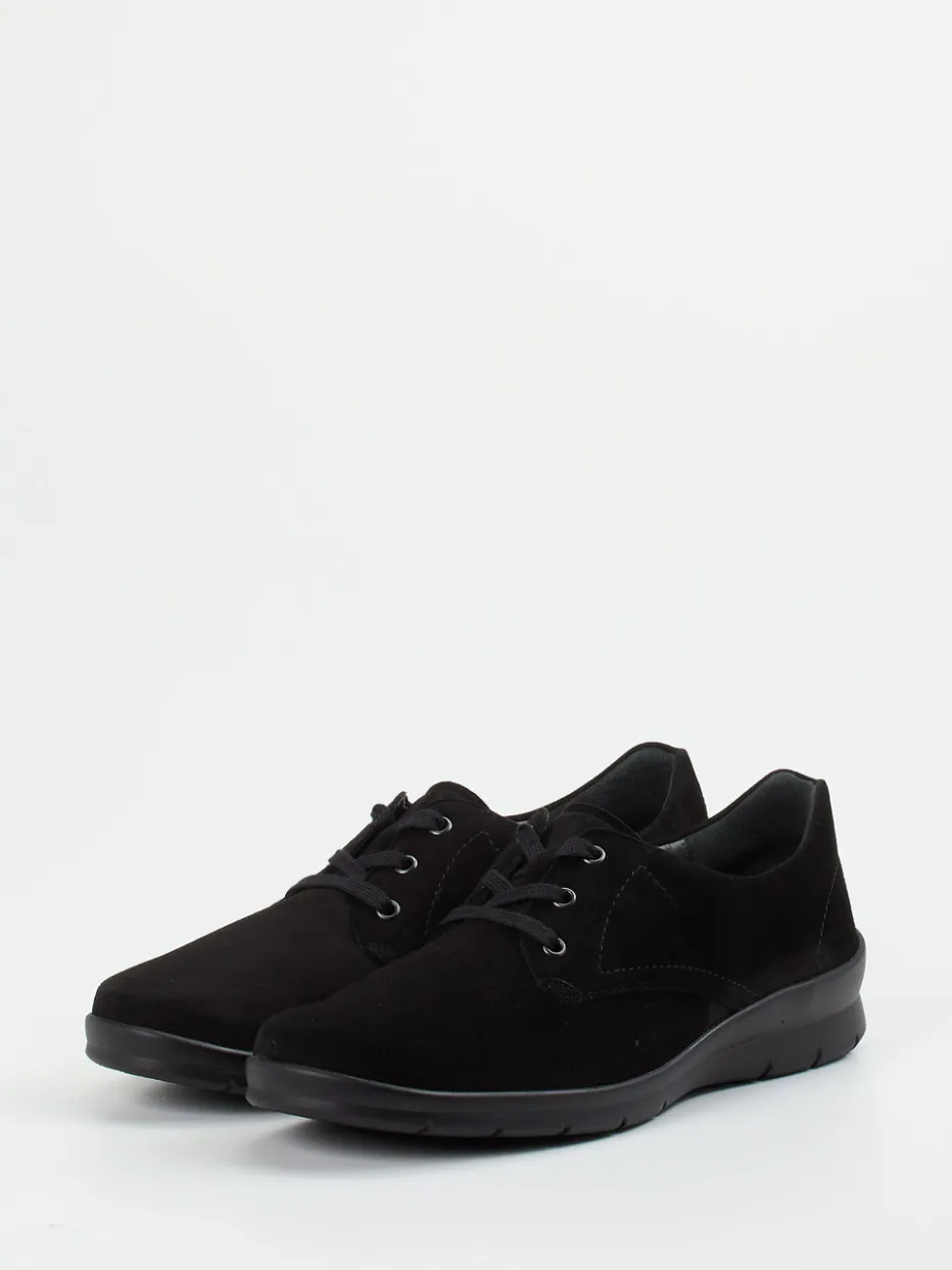 Minimalismus trifft Komfort.Semler präsentiert mit diesem Komfort-Halbschuh für Damen ein stilistisch reduziertes Modell in schwarzem Veloursleder. Die samtig-matte Oberfläche ergänzt sich mit einer Ton-in-Ton-Schnürung über Metallösen und einer klassischen, flachen Silhouette. Abgestimmt auf den täglichen Einsatz sorgt die leicht profilierte PU-Luftpolstersohle für sicheren Halt, während ein ergonomisches Vario-Fußbett höchsten Tragekomfort bietet. Der gepolsterte Einstieg und die weiche Weite H runden das funktionale Design ab. Perfekt kombinierbar mit schlichten Stoffhosen oder minimalistischer Geschäftsgarderobe. Komfortabel, zeitlos und mit gehobenem Finish – Semler-Qualität für anspruchsvolle Füße.