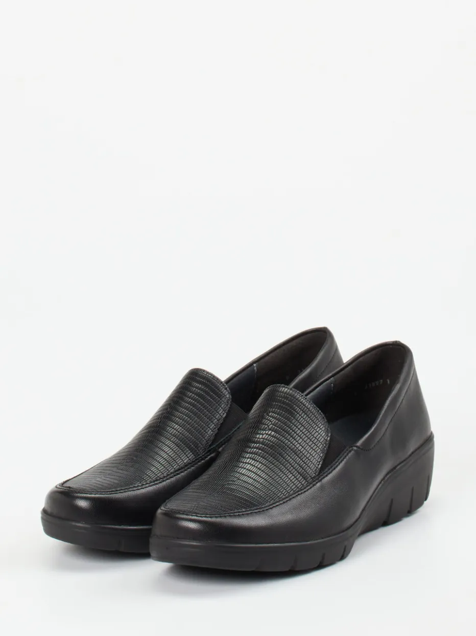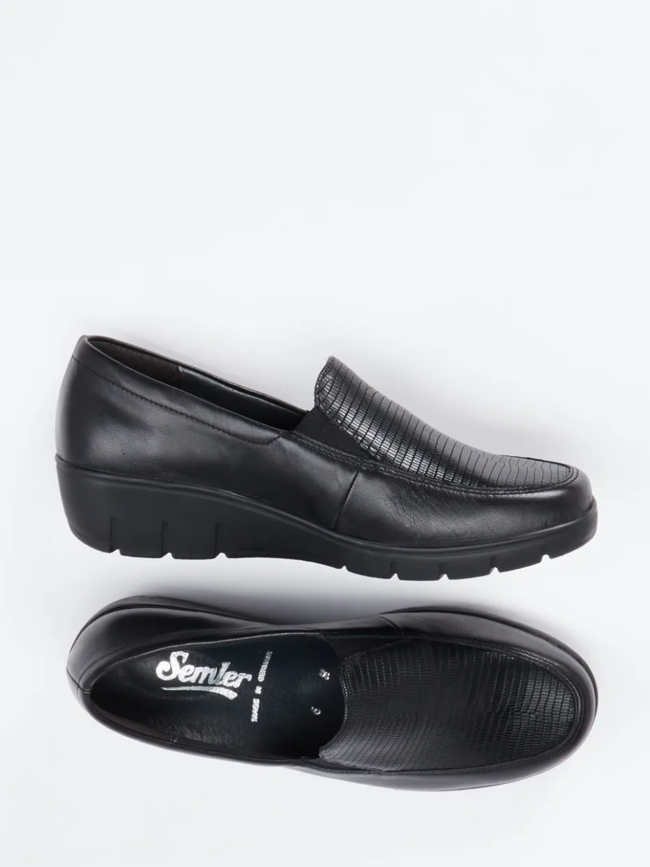 Schwarzer Komfort neu gedacht.Dieser Damen-Komfortslipper von Semler verbindet Handwerkskunst mit moderner Zurückhaltung. Für lange Tage im Büro oder unterwegs bietet das Modell Judith mit seiner bequemen H-Weite und dem elastischen Einstieg spürbare Entlastung. Gefertigt aus hochwertigem Kalbleder mit matt geprägter Reptilstruktur, wirkt das Design klar und edel zugleich. Die gerundete Silhouette sowie das dezente Ton-in-Ton-Finish unterstreichen den Minimalismus. Dank der gepolsterten Wechselfußbettung sitzt der Schuh auch bei längerem Tragen angenehm – die stoßdämpfende PU-Sohle sorgt für sicheren Auftritt. Ideal zur Stoffhose oder Feinstrick-Kombi. Semler steht für Komfortschuhe mit Qualitätsversprechen und stilvollem Understatement.