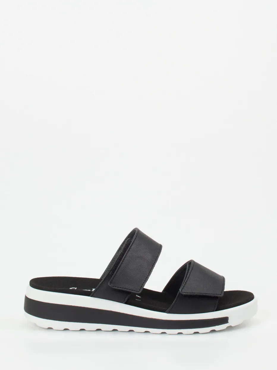 Ideal für entspannte Sommertage überzeugt sie mit ergonomischem Fußbett, weich gearbeitetem Kalbleder und komfortabler Weite H. Der schwarze Look wird durch eine weiße Kontrastsohle modisch akzentuiert, während zwei Klettverschlüsse für präzise Anpassung sorgen. Die offen ergonomisch geformte Silhouette sowie das rutschhemmende PU-Profil unterstreichen den funktionalen Anspruch dieses Modells. Ob zu Hause oder in der Freizeit – der minimalistische Stil trifft auf vielfach kombinierbaren Komfort.