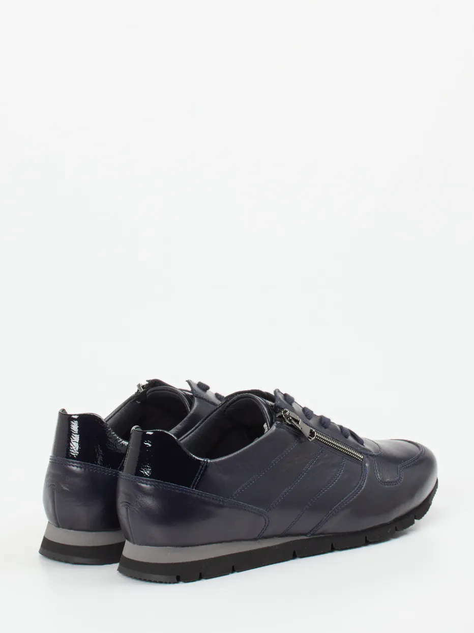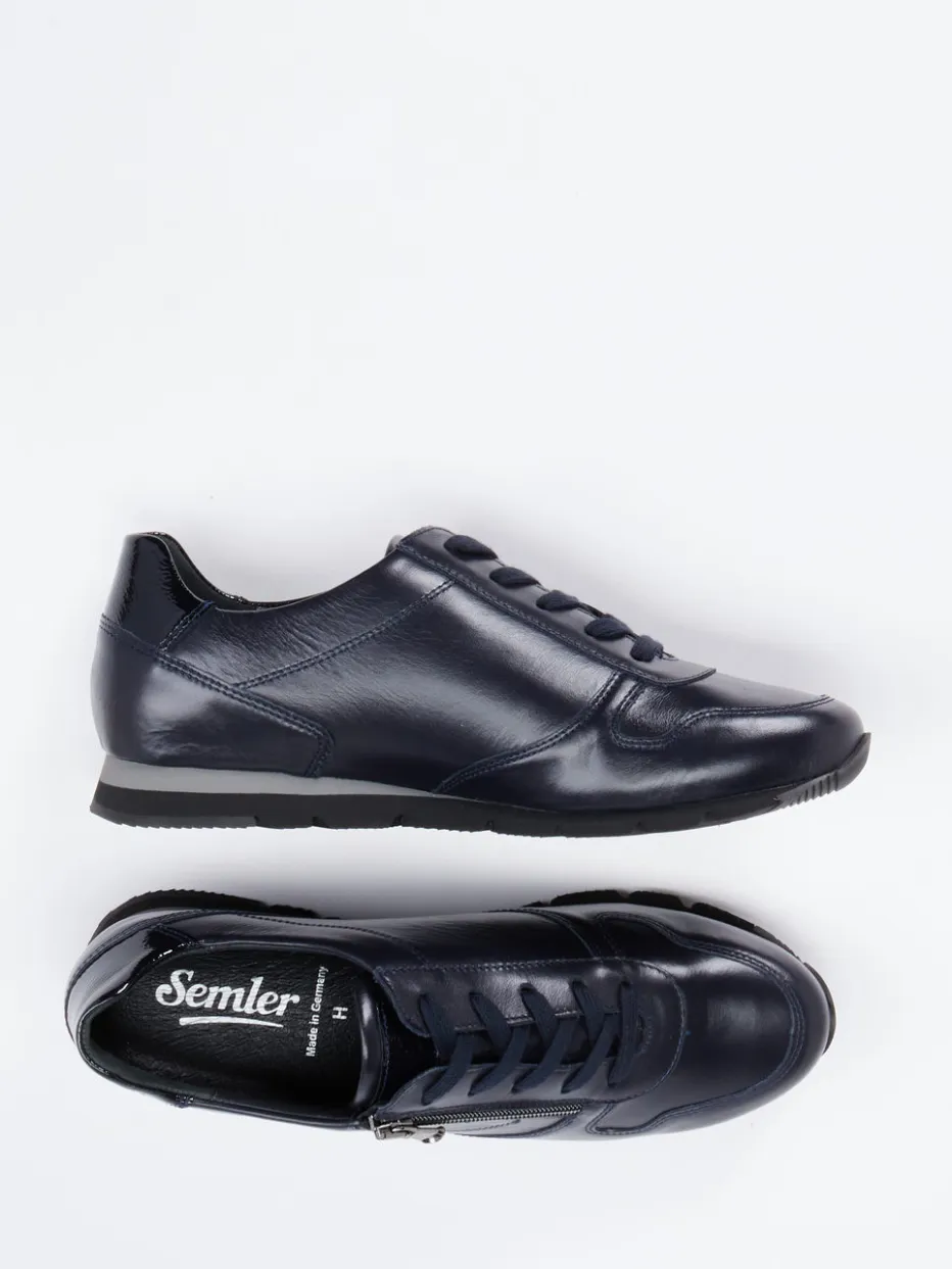 Eleganz und Komfort auf Schritt und Tritt.Semler präsentiert diesen komfortablen Damen-Sneaker aus edlem Kalbleder. Ideal für entspannte Freizeittage oder längere Wege im Alltag: Das nachtblaue Kalbleder besticht durch seine glatte, dezent glänzende Oberfläche und wird durch Lackleder-Details an der Ferse stilvoll ergänzt. Für einfaches An- und Ausziehen sorgt ein silberfarbener Reißverschluss neben der tonigen Schnürung. Die profilierte Gummisohle bietet zuverlässigen Grip, das gepolsterte, lederbezogene Wechselfußbett sorgt für angenehmes Laufgefühl. Optimal kombinierbar zu Stretch-Jeans oder minimalistischen Looks. Perfekte Balance aus Komfort und stilvoller Zurückhaltung – typisch Semler.